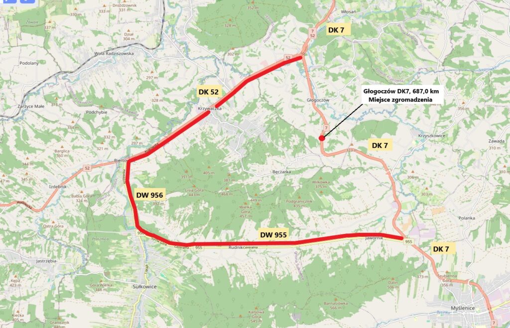 W związku z zaplanowanym na niedzielę (23 listopada) protestem mieszkańców przeciwko budowie S7 przez teren gminy Myślenice, który to protest odbędzie się między godziną 13 a 15 na przejściu dla pieszych przez zakopiankę w Głogoczowie (gm. Myślenice), policja zaleca kierowanie się na objazdy.