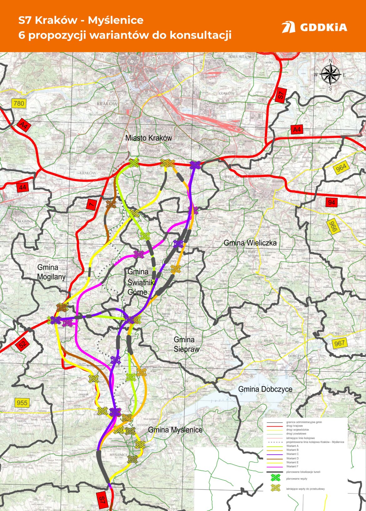 Po wielu miesiącach analiz, opóźnień i nieoficjalnych przecieków Generalna Dyrekcja Dróg Krajowych i Autostrad wreszcie ujawniła warianty przebiegu nowej drogi ekspresowej S7 z Krakowa do Myślenic. Na stronie GDDKiA Kraków opublikowano opis sześciu tras, które mają zostać skierowane do konsultacji społecznych.
