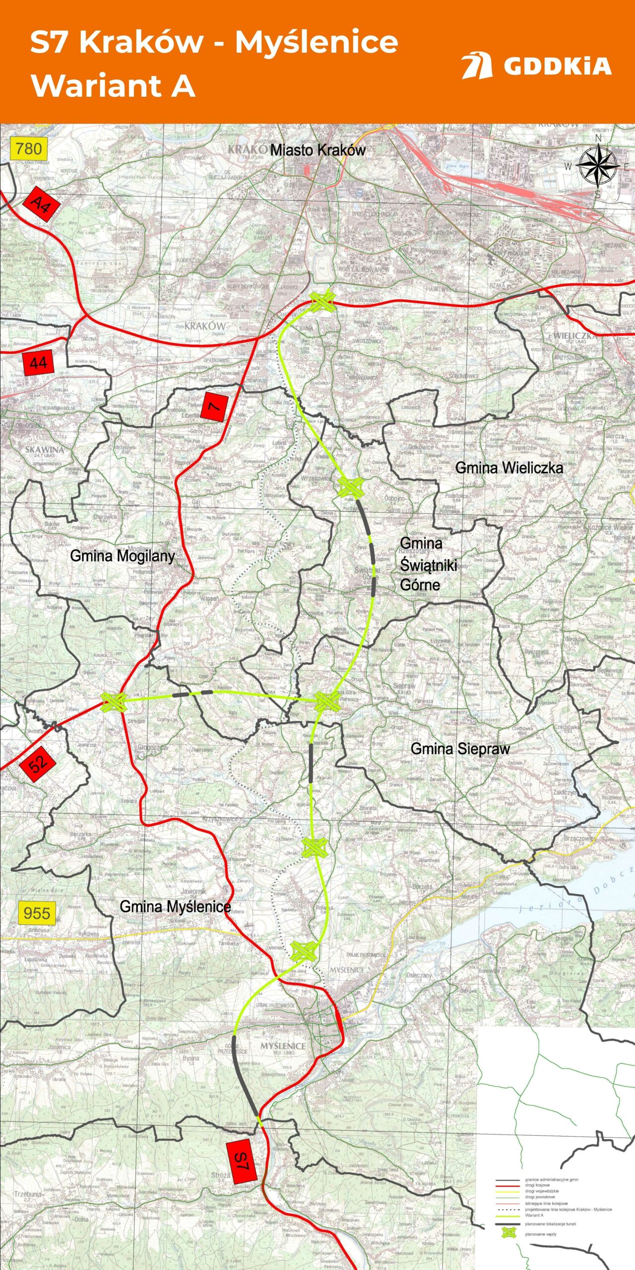 ➡ Wariant A – początek na węźle Łagiewniki, trasa biegnie na zachód od Swoszowic przez Świątniki Górne i Siepraw, łączy się z DK7 za Plebańską Górą.