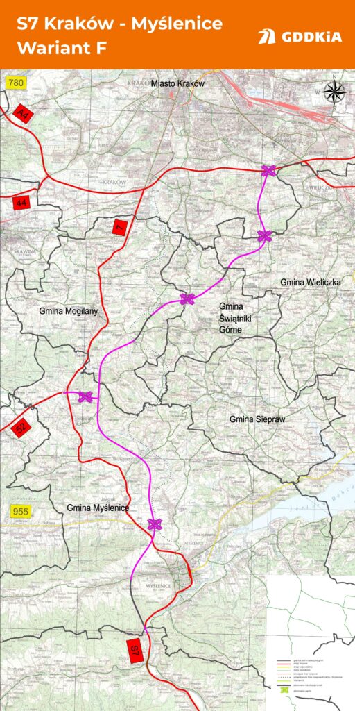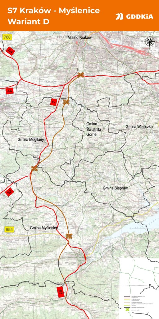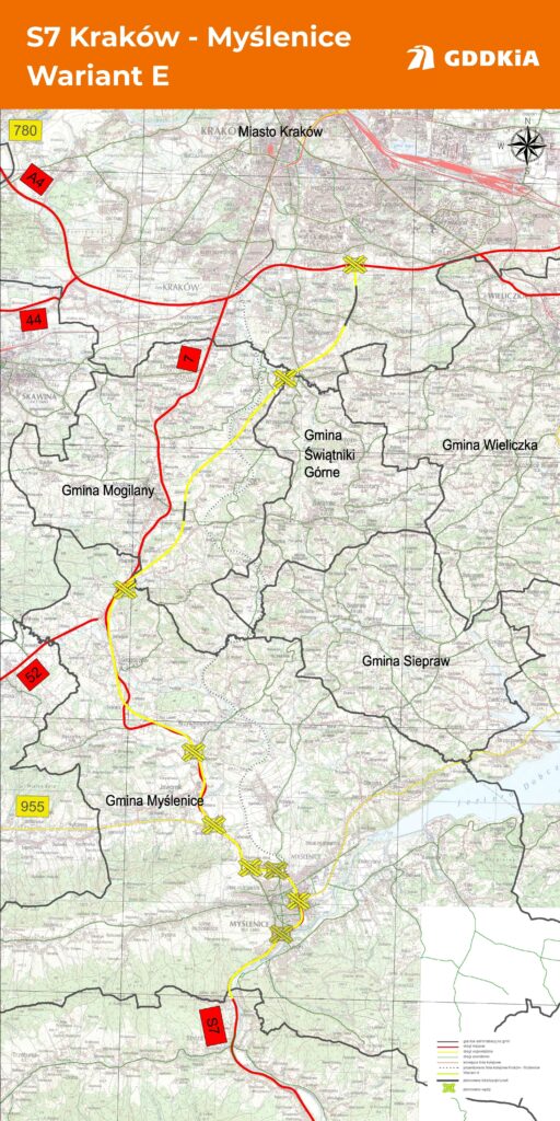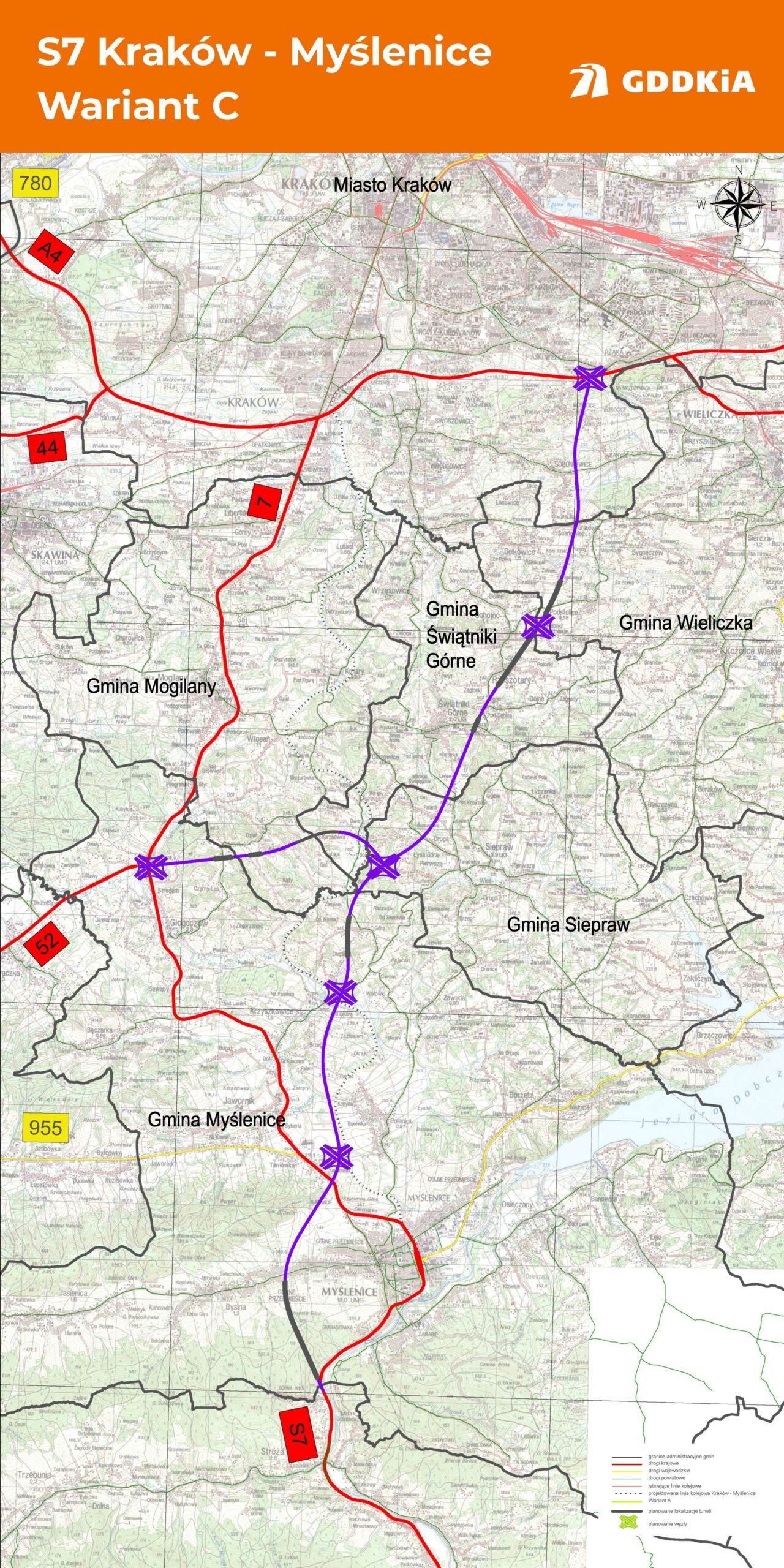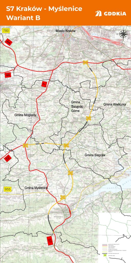 ➡ Wariant B – start na planowanym węźle Tuchowska, biegnie przez gminy Wieliczka, Świątniki Górne i Siepraw, włącza się w DK7 również za Plebańską Górą.