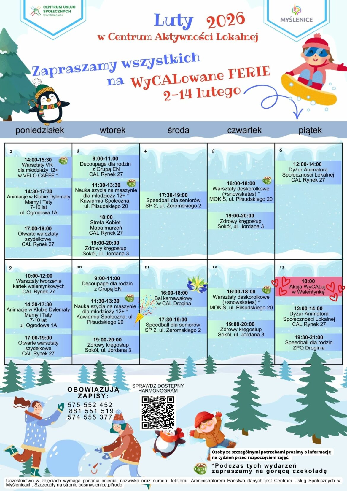 Od poniedziałku 2 lutego do soboty 13, w Centrum Aktywności Lokalnej w Myślenicach (i nie tylko tam) codziennie, z wyjątkiem niedzieli, na chętnych będą czekały różnorodne bezpłatne zajęcia. Warto zapisywać się już teraz, bo ilość miejsc jest ograniczona.