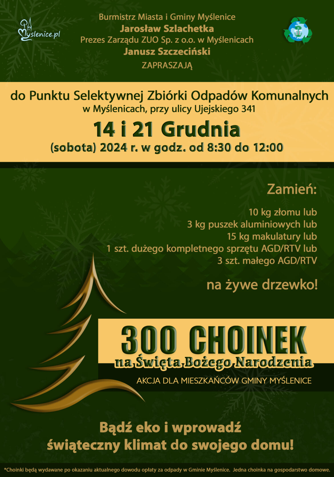 Już niedługo, bo w dwie kolejne soboty (14 i 21 grudnia) będzie okazja otrzymać choinkę w zamian za posegregowane odpady. Akcja jest adresowana do mieszkańców gminy Myślenice, a żeby cieszyć się świątecznym żywym drzewkiem wystarczy w jedną z tych sobót między godz. 8.30 a 12 dostarczyć do PSZOK-U, czyli Punktu Selektywnej Zbiórki Odpadów Komunalnych przy ul. Ujejskiego 341, wybrane odpady.