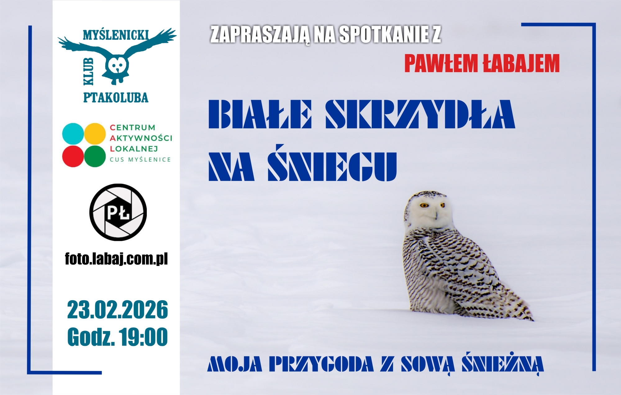 W poniedziałek 23 lutego o godz. 19 w Centrum Aktywności Lokalnej w Myślenicach (Rynek 27) odbędzie się prelekcja Pawła Łabaja zatytułowana „Białe skrzydła na śniegu – moja przygoda z sową śnieżną”.