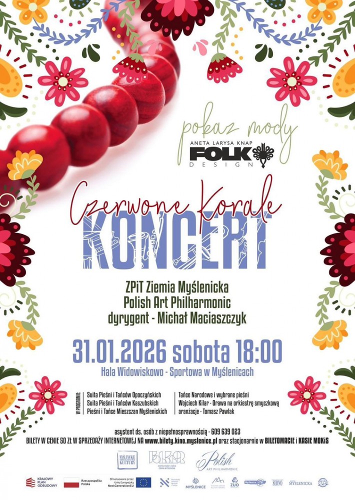 W sobotę 31 stycznia o godz. 18 w hali widowiskowo-sportowej w Myślenicach (Zarabie) odbędzie się koncert „Czerwone korale” z udziałem Zespołu Pieśni i Tańca „Ziemia Myślenicka” oraz Polish Art Philharmonic pod batutą Michała Maciaszczyka. Autorem aranżacji jest Tomasz Pawlak.