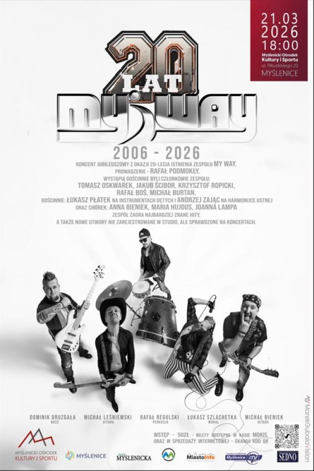 W sobotę 21 marca o godz. 18 w Myślenickim Ośrodku Kultury i Sportu zespół My Way zagra koncert z okazji jubileuszu 20-lecia swojego istnienia.