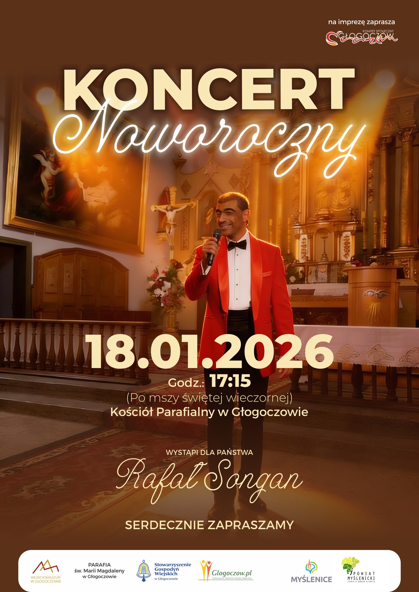 Kolędy oraz pastorałki zaśpiewa Rafał Songan, artysta o międzynarodowej renomie, m.in. półfinalista Konkursu im. L. Pavarottiego w Modenie oraz finalista Konkursu im. Didura – piszą organizatorzy, czyli Komitet Społeczny Głogoczów Razem.