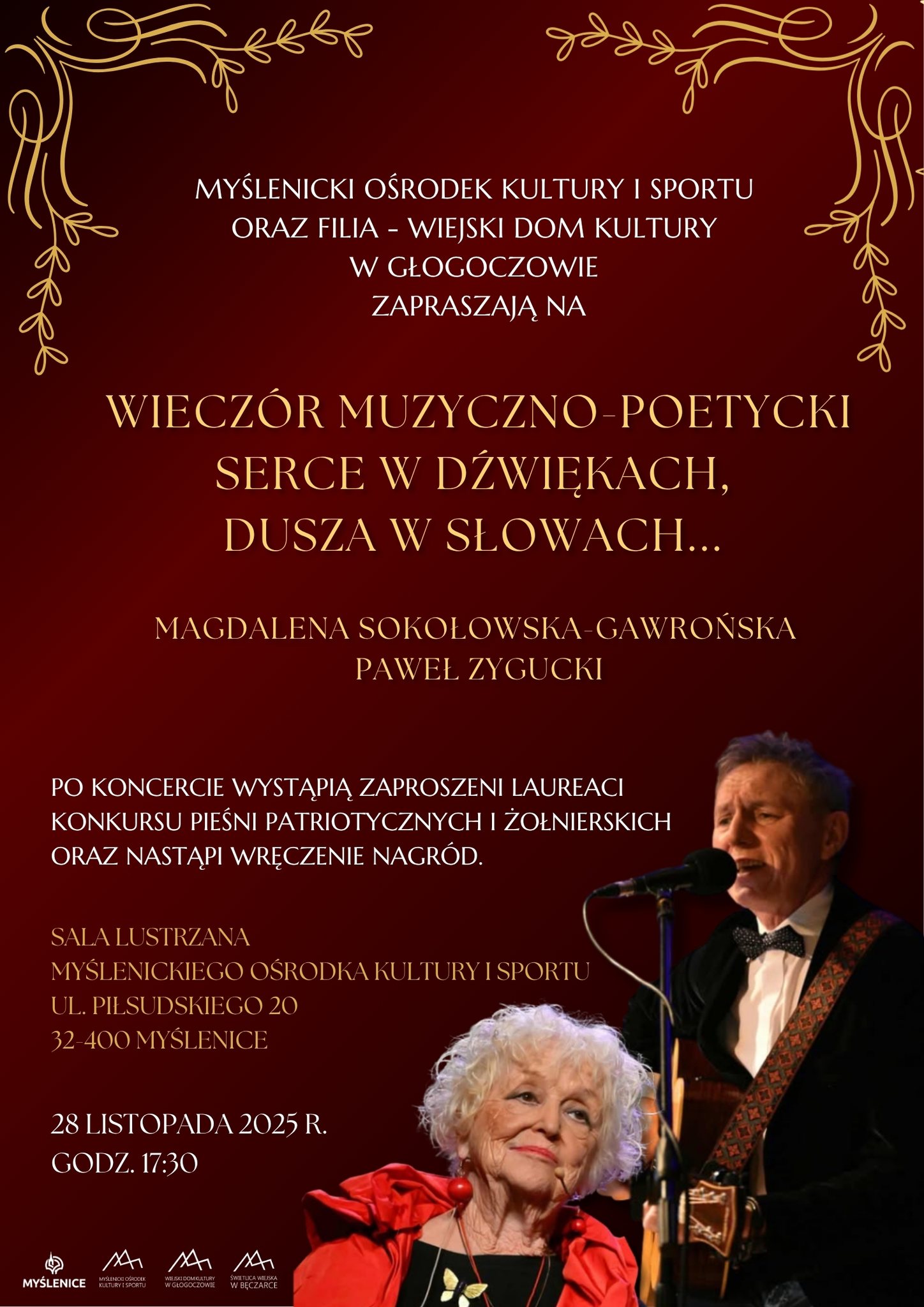 W piątek 28 listopada o godz. 18 w sali lustrzanej Myślenickiego Ośrodka Kultury i Sportu odbędzie się koncert muzyczno- literacki pt. „Serce w dźwiękach, dusza w słowach”