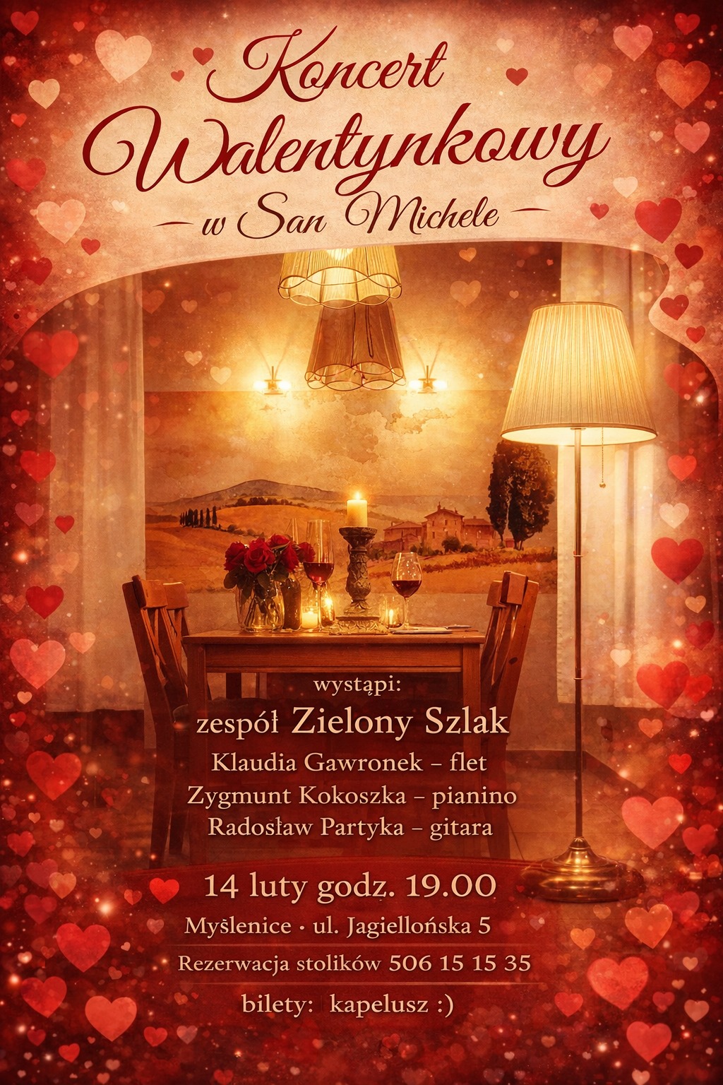 W sobotę 14 lutego o godz. 19 w pizzerii San Michele w Myślenicach wystąpi zespół Zielony Szlak w składzie: Radek Partyka (gitara), Zygmunt Kokoszka (pianino ) i Klaudia Gawronek (flet).