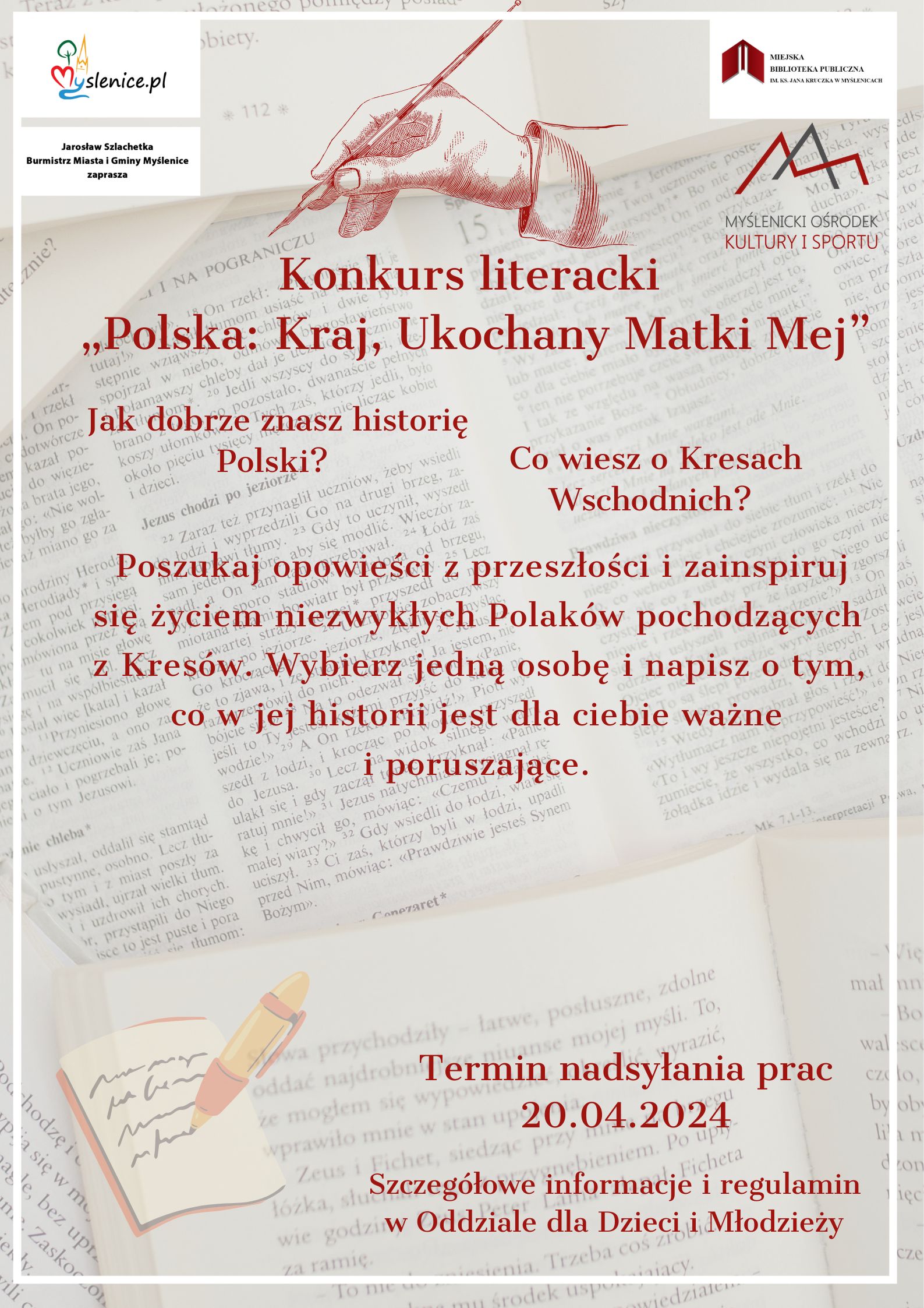 Miejska Biblioteka Publiczna im. ks. Jana Kruczka w Myślenicach we współpracy z gminą Myślenice organizuje konkurs literacki pt. „Polska, kraj ukochany Matki mej” i zaprasza dzieci i młodzież do wzięcia udziału w nim.