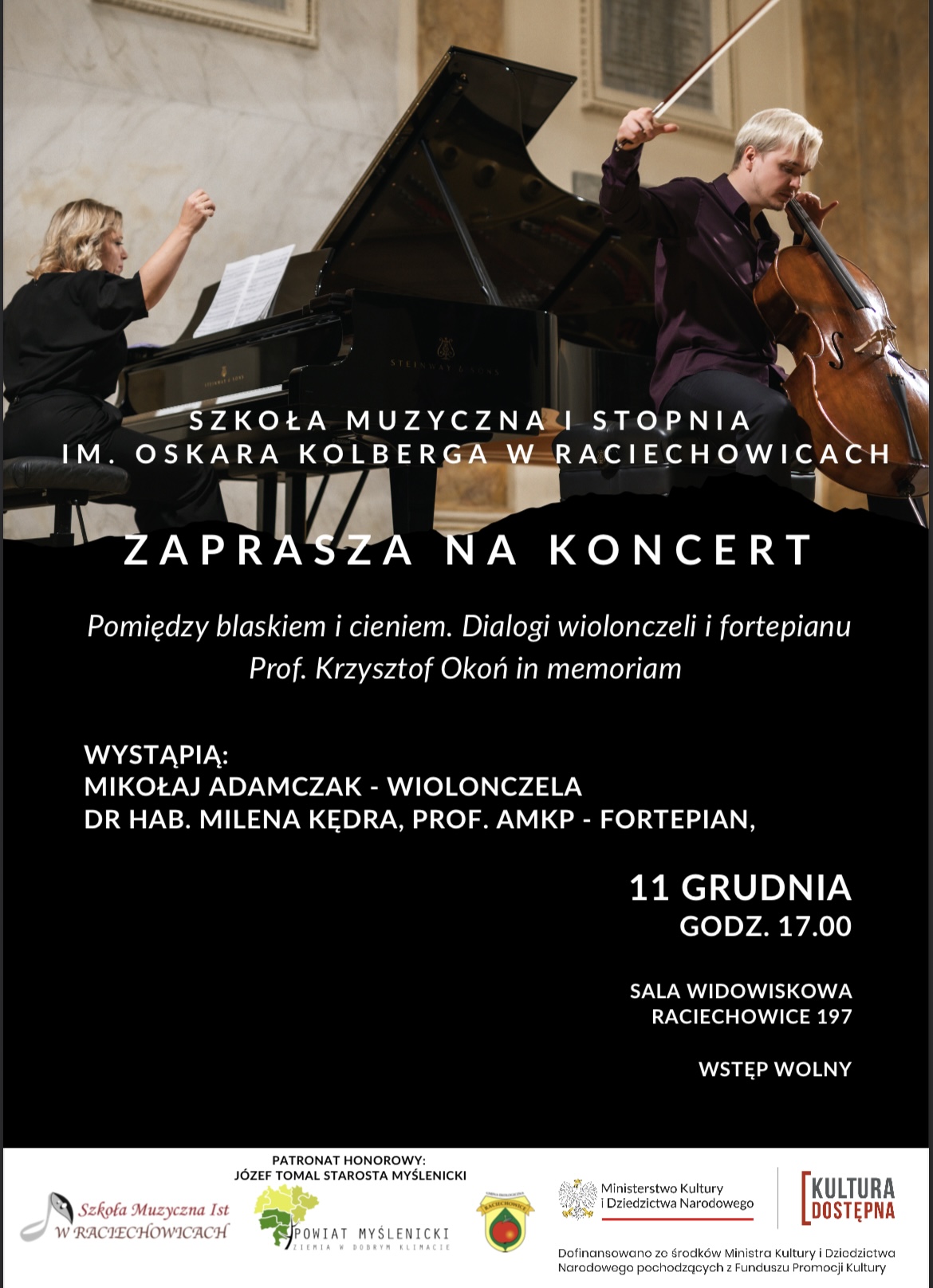 Dialogi wiolonczeli i fortepianu – Prof. Krzysztof Okoń in memoriam”. Podczas wydarzenia wystąpią dr hab. Milena Kędra, prof. AMKP oraz Mikołaj Adamczak, prezentując program: