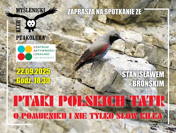 W poniedziałek 22 września o godz. 18.30 w siedzibie Centrum Aktywności Lokalnej (Rynek 27) Myślenicki Klub Ptakoluba organizuje spotkanie ze Stanisławem Brońskim. Będzie ono poświęcone ptakom spotykanym w polskiej części Tatr a jego tytuł to „Ptaki polskich Tatr. O pomurniku i nie tylko słów kilka”.