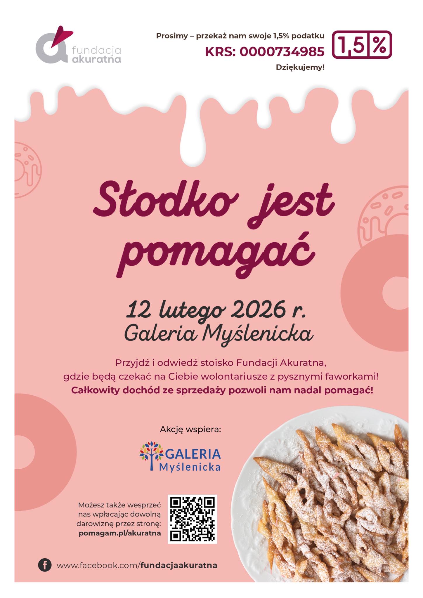 W czwartek 12 lutego Fundacja Akuratna organizuje akcję „Słodko jest pomagać”. W jej ramach zaprasza na swoje stoisko w Galerii Myślenie, na którym członkowie „Akuratnej” będą sprzedawali pączki i faworki.