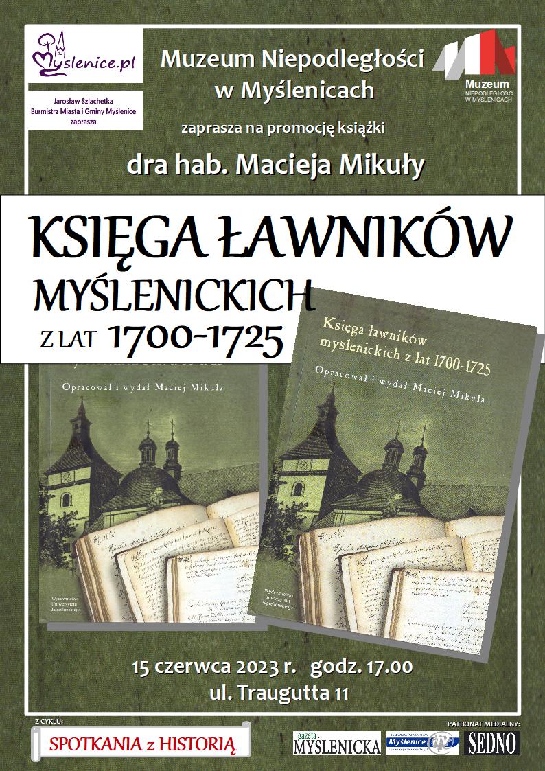 Muzeum Niepodległości w Myślenicach zaprasza na promocję książki „Księga ławników myślenickich (1700 – 1725)” z udziałem jej autora, dra hab. Macieja Mikuły, która odbędzie się 16 czerwca o godzinie 17.00. Książka została wydana przy wsparciu finansowym muzeum i po „Oppidum nostrum Mislimicze” stanowi naszą drugą publikację źródłoznawczą do historii Myślenic. Tym razem w ręce czytelnika oddana została edycja dokumentów, których oryginały znajdują się w archiwum naszego muzeum. Wierzymy, że wielu dzisiejszych myśleniczan będzie mogło odnaleźć w tej książce wzmianki o swoich przodkach.