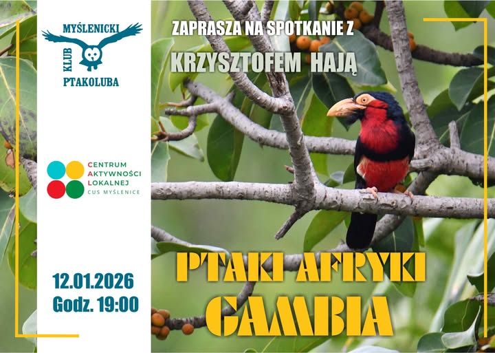 Myślenicki Klub Ptakoluba zaprasza na poniedziałkowe (12 stycznia) spotkanie z Krzysztofem Hają (Bird Guide), wybitnym znawcą fauny jezior afrykańskich i autorem książki „Pielęgnice Jeziora Wiktorii”. Jego tematem będą ptaku Afryki, a dokładnie Gambii.