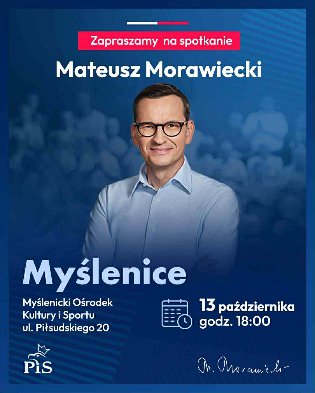 Były premier Mateusz Morawiecki spotka się z mieszkańcami Myślenic W poniedziałek, 13 października o godzinie 18:00 w Myślenickim Ośrodku Kultury i Sportu odbędzie się otwarte spotkanie byłego premiera Mateusza Morawieckiego z mieszkańcami. Wydarzenie organizowane jest w ramach cyklu spotkań z obywatelami, podczas których były szef rządu prezentuje swoje spojrzenie na aktualną sytuację polityczną i gospodarczą kraju oraz odpowiada na pytania uczestników. Jak zapowiadają organizatorzy, każdy zainteresowany będzie mógł wziąć udział w dyskusji. Mateusz Morawiecki, pełniący funkcję premiera w latach 2017–2023, należy do czołowych polityków Prawa i Sprawiedliwości. Jego wizyty zawsze przyciągają dużą uwagę opinii publicznej i licznych mieszkańców. Na wydarzenie zaprasza Jarosław Szlachetka burmistrz Myślenic wspólnie z parlamentarzystami Klubu Parlamentarnego Prawo i Sprawiedliwość.