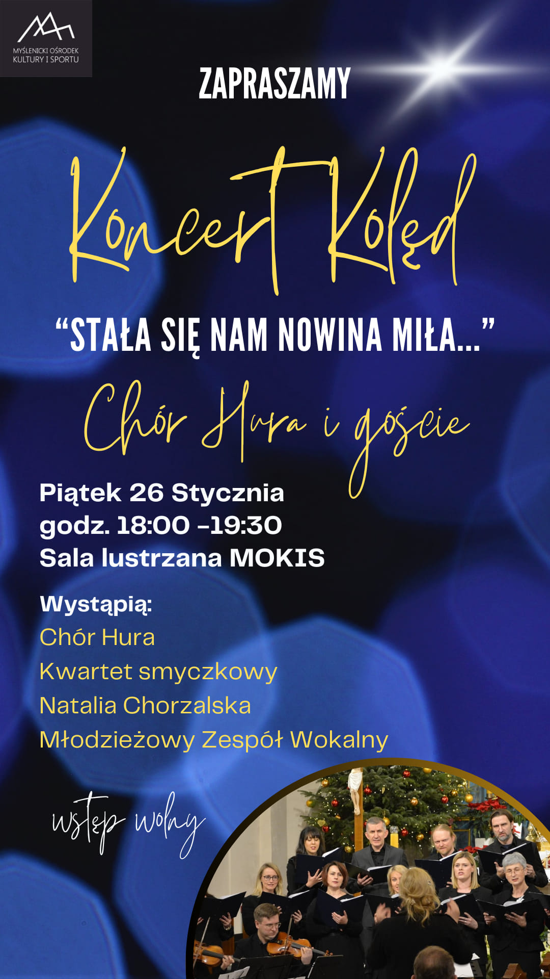W piątek 26 stycznia o godz. 18 w sali lustrzanej Myślenickiego Ośrodka Kultury i Sportu odbędzie się Koncert Kolęd „Stała się nam nowina miła” w wykonaniu Chóry Hura i jego Gości.