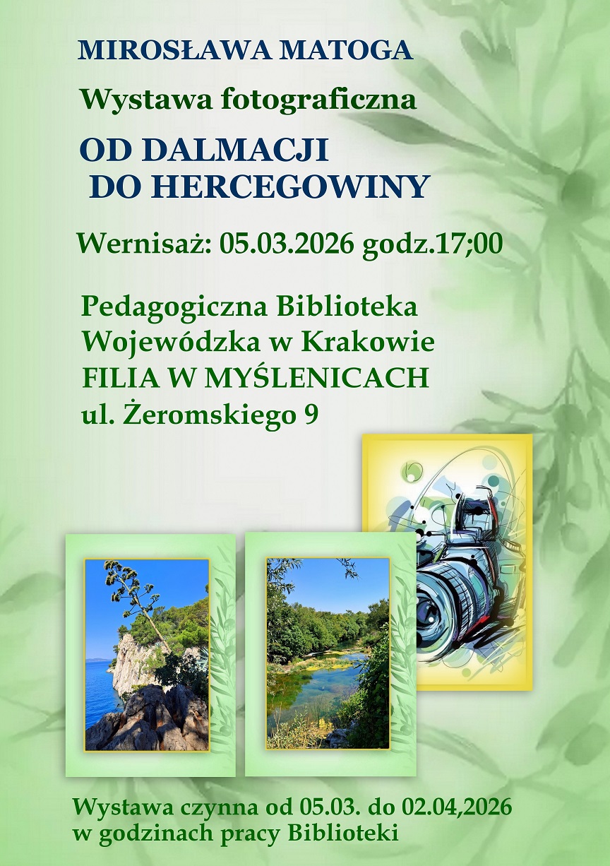 W czwartek 5 marca o godz. 17 w czytelni Biblioteki Pedagogicznej w Myślenicach zostanie otwarta wystawa fotografii Mirosławy Matogi zatytułowana „Od Dalmacji do Hercegowiny”. Wernisaż wzbogaci prelekcja autorki połączona z pokazem slajdów „Opowieści znad Neretwy”.