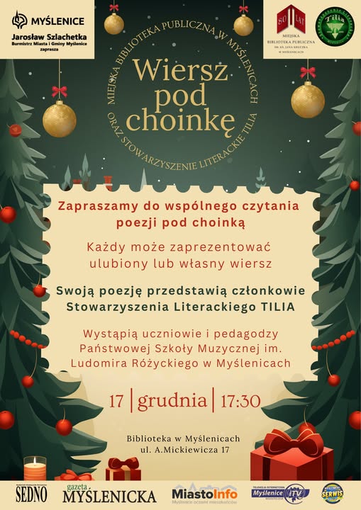 W środę 17 grudnia o godz. 17.30 w Miejskiej Bibliotece Publicznej im. ks. Jana Kruczka w Myślenicach rozpocznie się doroczne wspólne czytanie poezji pod choinką. Jak w poprzednich latach, każdy będzie mógł zaprezentować ulubiony wiersz (mile widziane są także własne utwory), a członkowie Tilii zaprezentują własne. Dodatkowo wieczór uświetni występ uczniów i pedagogów Państwowej Szkoły Muzycznej I st. im. Ludomira Różyckiego w Myślenicach.