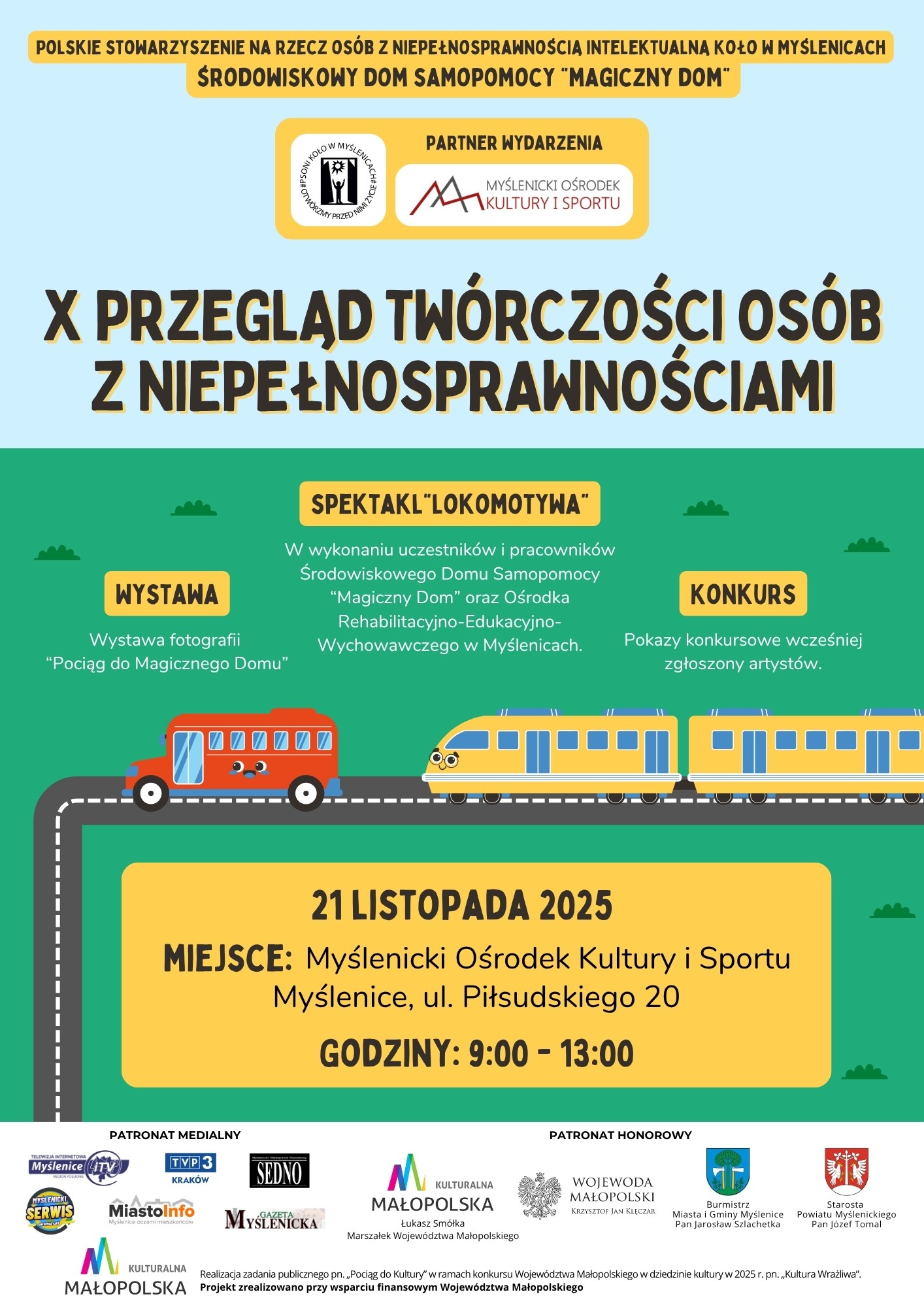 Organizatorami wydarzenia są: Środowiskowy Dom Samopomocy Magiczny Dom w Myślenicach oraz myślenickie koło PSONI, zaś partnerem Myślenicki Ośrodek Kultury i Sportu. Odbędzie się ono w ramach projektu „Pociąg do Kultury”, realizowanego przy wsparciu finansowym Województwa Małopolskiego.