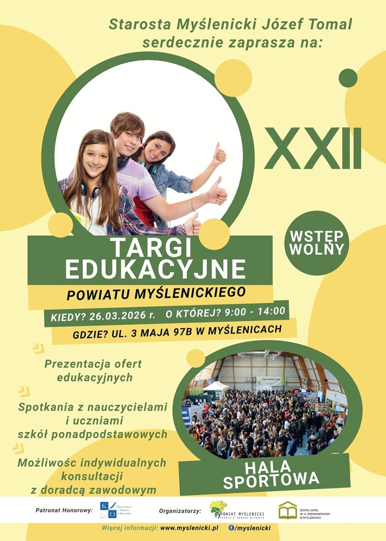 W czwartek 26 marca w hali sportowej Zespołu Szkół im. Andrzeja Średniawskiego w Myślenicach (ul. 3 Maja 97 B) odbędą się XXII Targi Edukacyjne Powiatu Myślenickiego.