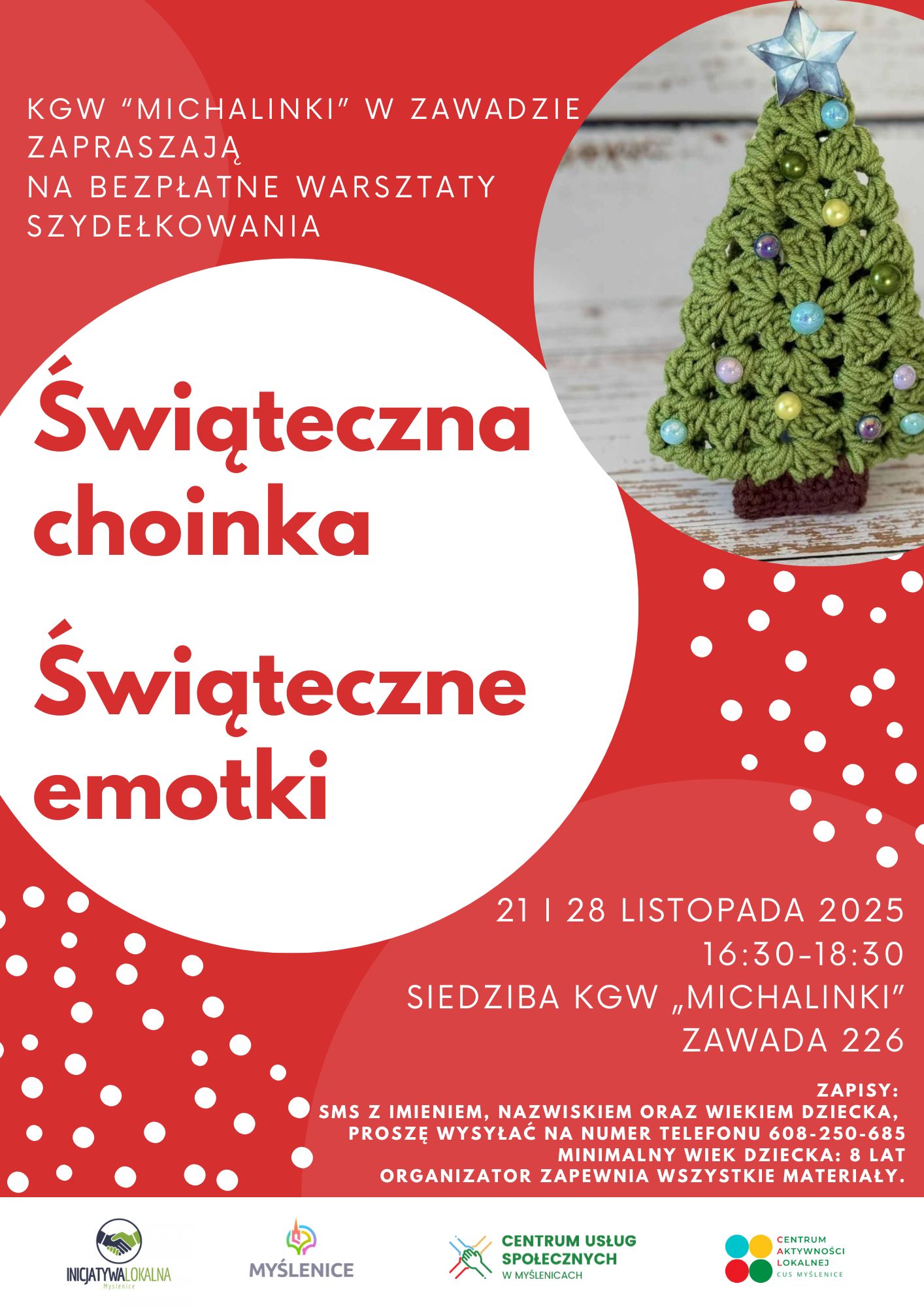 Koło Gospodyń Wiejskich „Michalinki” w Zawadzie organizuje zajęcia dzieci od 8. roku życia kreatywne zajęcia pt. „Świąteczna choinka i świąteczne emotki”.