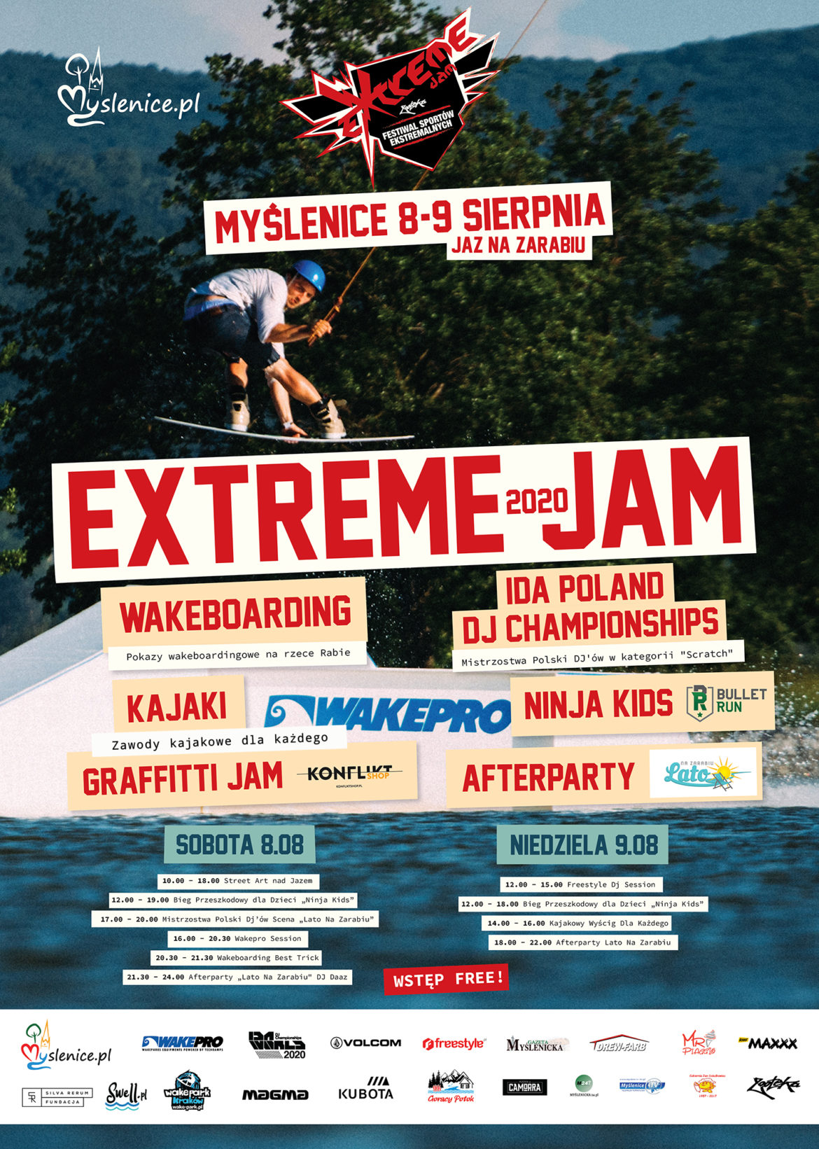 Wakeboarding to niezwykle spektakularna dyscyplina sportowa. Nasze pokazy zaplanowaliśmy w pierwszy dzień Extreme Jam. W sobotę zorganizujemy je po zmroku przy udziale specjalnego oświetlenia i oprawy muzycznej. Zawodnicy rywalizować będą o nagrody ufundowane przez: termy Gorący Potok, firmę Volcom oraz 1000 zł i specjalne trofeum „Myślenice Extreme Jam Wakebaording Best Trick” ufundowane przez Miasto i Gminę Myślenice. Organizatorzy liczą na powrót tej dyscypliny podczas Festiwalu Extreme Jam 2021. Partnerami technicznymi strefy wakeboard jest Wakepark Kraków oraz Wakepro.eu