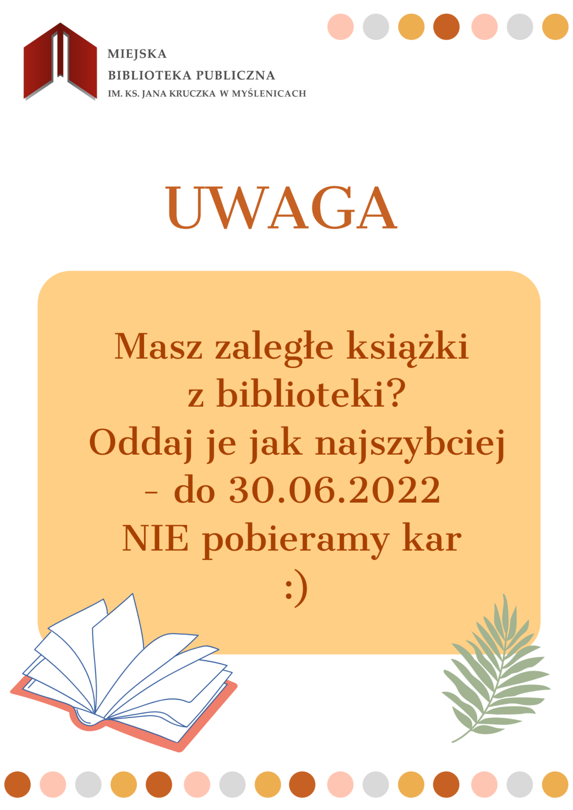 Miejska Biblioteka Publiczna im. ks. Jana Kruczka, informuje wszystkich spóźnialskich, że do 30 czerwca nie będą pobierane kary za nieterminowy zwrot wypożyczonych pozycji. Nie ma zatem na co czekać !