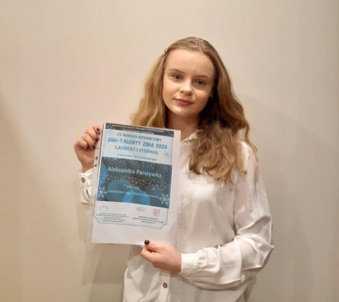 W Międzynarodowym Konkursie Internetowym Digi – Talenty Zima 2020 wzięło udział ponad 1500 osób z Rosji, Białorusi, Ukrainy, Litwy, Łotwy, Estonii, Bułgarii, Mołdawii USA, Indonezji, Turcji, Hiszpanii i Polski. Uczestnicy, z podziałem na grupy wiekowe, rywalizowali w różnych kategoriach m.in. tanecznych, wokalnych i teatralnych. Ola wygrała w kategorii solo wokalne w grupie wiekowej od 12 do 14 lat. Wykonała kolędę „Uciekali, uciekali” z musicalu „Metro”. – Utwór ten idealnie pokazuje moje walory głosowe, zarówno niskie, jak i wysokie dźwięki. Poza tym podoba mi się tekst tej kolędy, jest bardzo poruszający – tłumaczy swój wybór Ola. Nastolatka bardzo cieszy się z osiągniętego sukcesu. – To konkurs o wysokiej randze, na poziomie międzynarodowym. Jestem dumna, że jury doceniło moje wykonanie. Długo przygotowywałam się do tego konkursu, ale dzięki temu satysfakcja jest jeszcze większa. Pracowałam nad techniką, interpretacją. Ważne jest bowiem to, by do każdej piosenki wnieść coś nowego, swojego, by nie była wykonana w taki sam sposób jak oryginał.