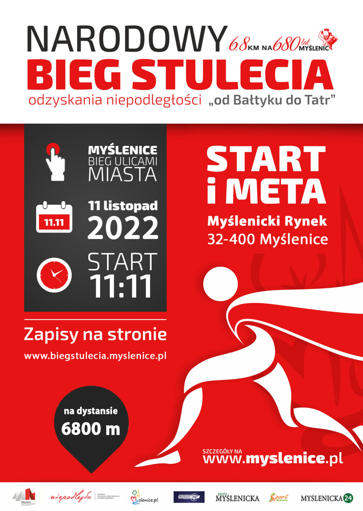 Narodowy Bieg Stulecia „od Bałtyku do Tatr” w Myślenicach wystartuje 11 listopada o 11:11, tym razem w zmienionej formie – na dystansie 6,8 km z okazji 680-lecia lokacji Myślenic. Start zaplanowany jest na Rynku obok Pomnika Niepodległości, a trasa poprowadzi ulicami centrum miasta. To okazja do świętowania naszej niepodległości na sportowo, zapraszamy do zapisów!