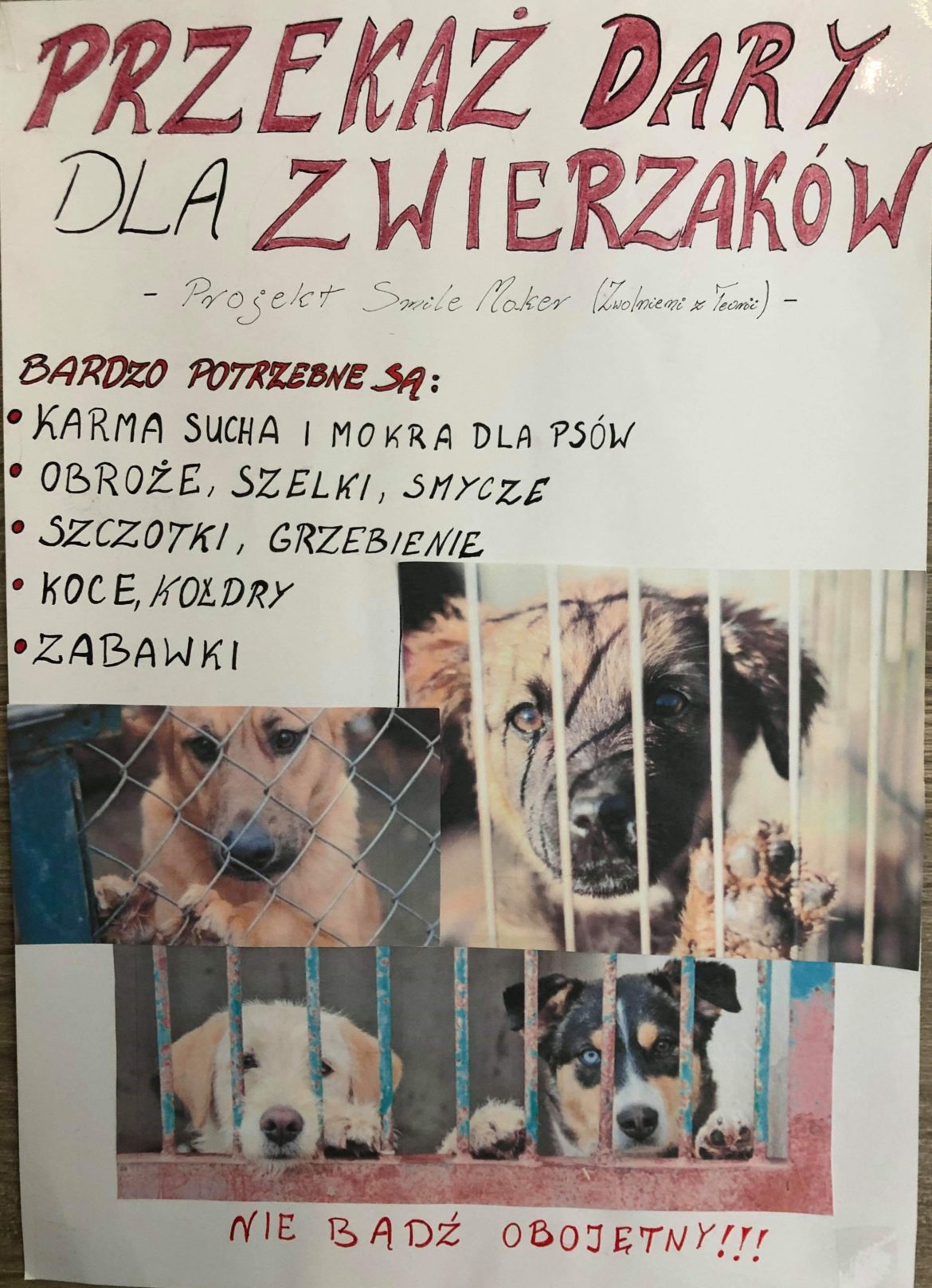 Nie po raz pierwszy okazuje się jak wielkie serca mają młodzi ludzie. Tym razem udowodnili to uczniowie Małopolskiej Szkoły Gościnności w Myślenicach organizując zbiórkę darów dla zwierząt. Dary można pozostawić w przygotowanym przez uczniów pojemniku w Przychodni Weterynaryjnej Vetmedica przy ulicy J. Piłsudskiego 17 w Myślenicach. Organizatorzy najbardziej liczą na karmy, suchą i mokrą, obroże, szelki, smycze, koce, kołdry i zabawki. Zebrane w czasie akcji rzeczy zostaną przekazane do schroniska dla bezdomnych zwierząt.