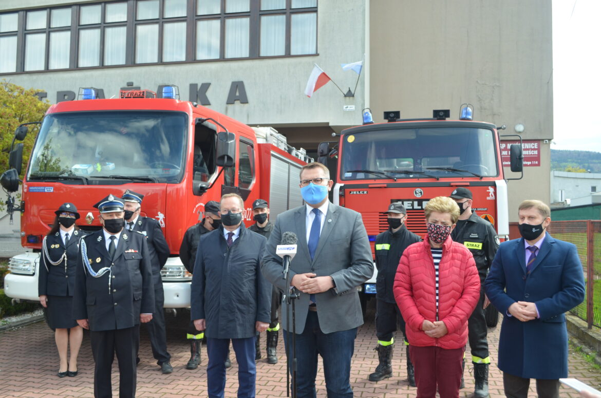 Podczas konferencji przed budynkiem strażnicy OSP Dolne Przedmieście burmistrz Myślenic Jarosław Szlachetka wraz z posłem Władysławem Kurowskim oraz prezesem OSP Dolne Przedmieście Edwadem Łapą poinformowali uzyskaniu środków na zakup średniego wozu bojowego dla jednostki OSP.