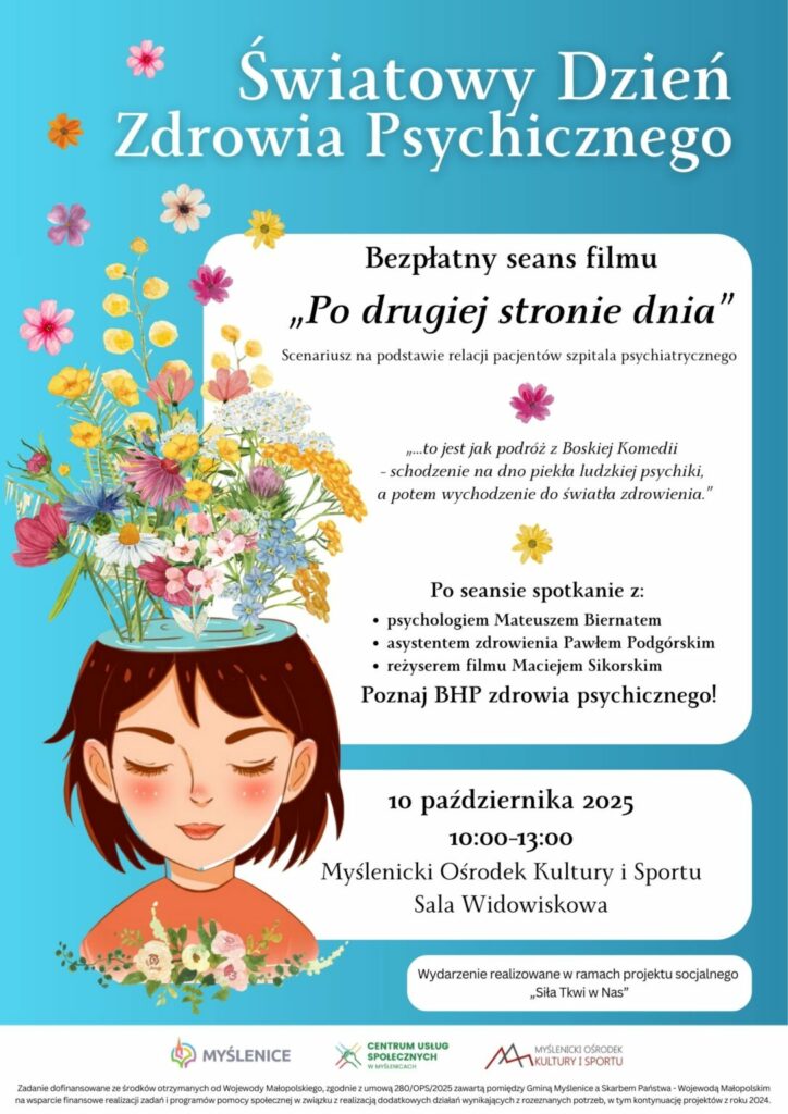Już w najbliższy piątek 10 października obchodzony będzie Światowy Dzień Zdrowia Psychicznego. Z tej okazji Centrum Usług Społecznych w Myślenicach zaprasza na bezpłatny seans filmowy a po nim spotkanie psychologiem, asystentem zdrowienia oraz reżyserem filmu „Po drugiej stronie dnia”, który zostanie wyświetlony.