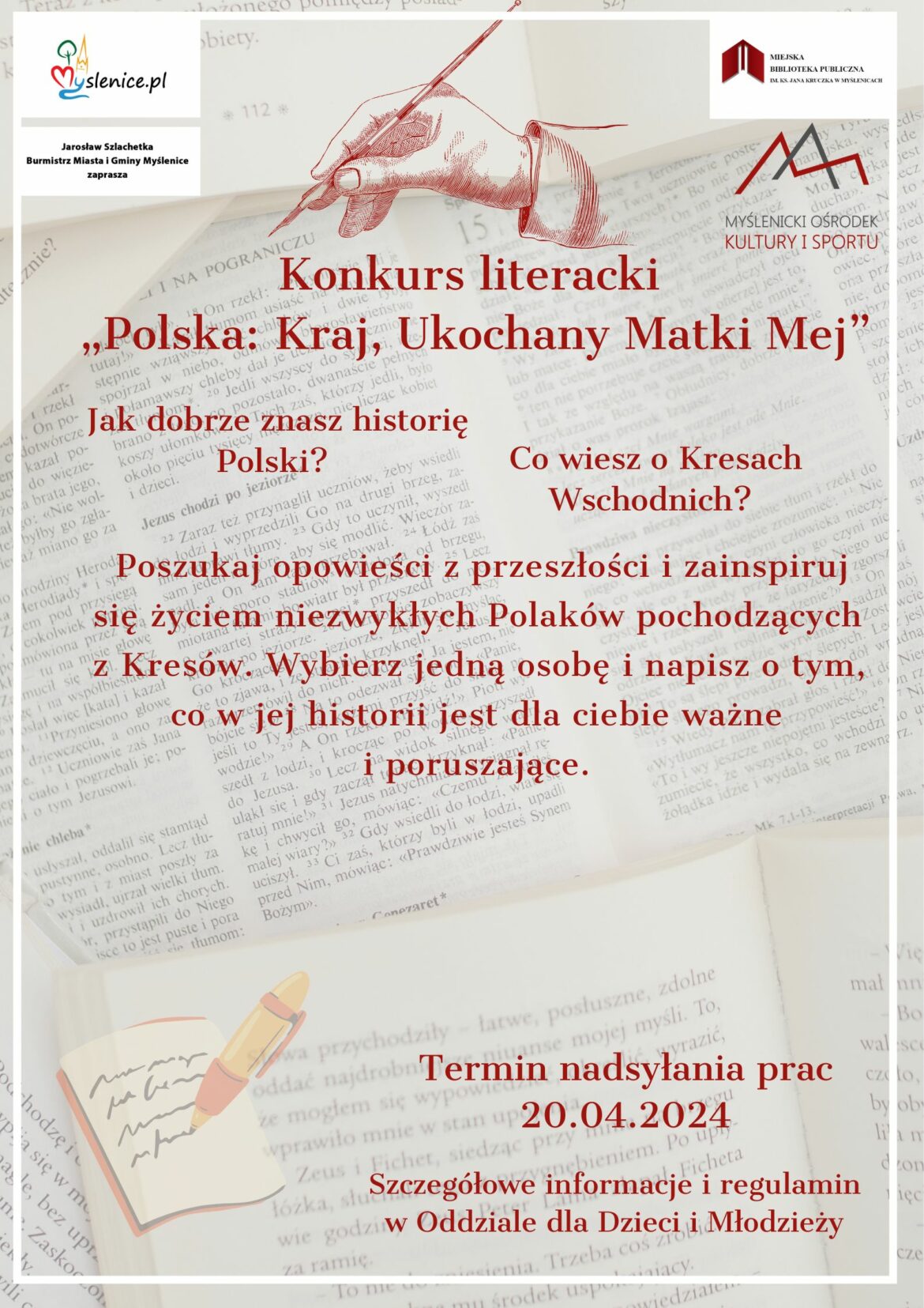Szczegóły na stronie: https://biblioteka.myslenice.pl/2024/03/12/oglaszamy-konkurs-literacki-polska-kraj-ukochany-matki-mej/