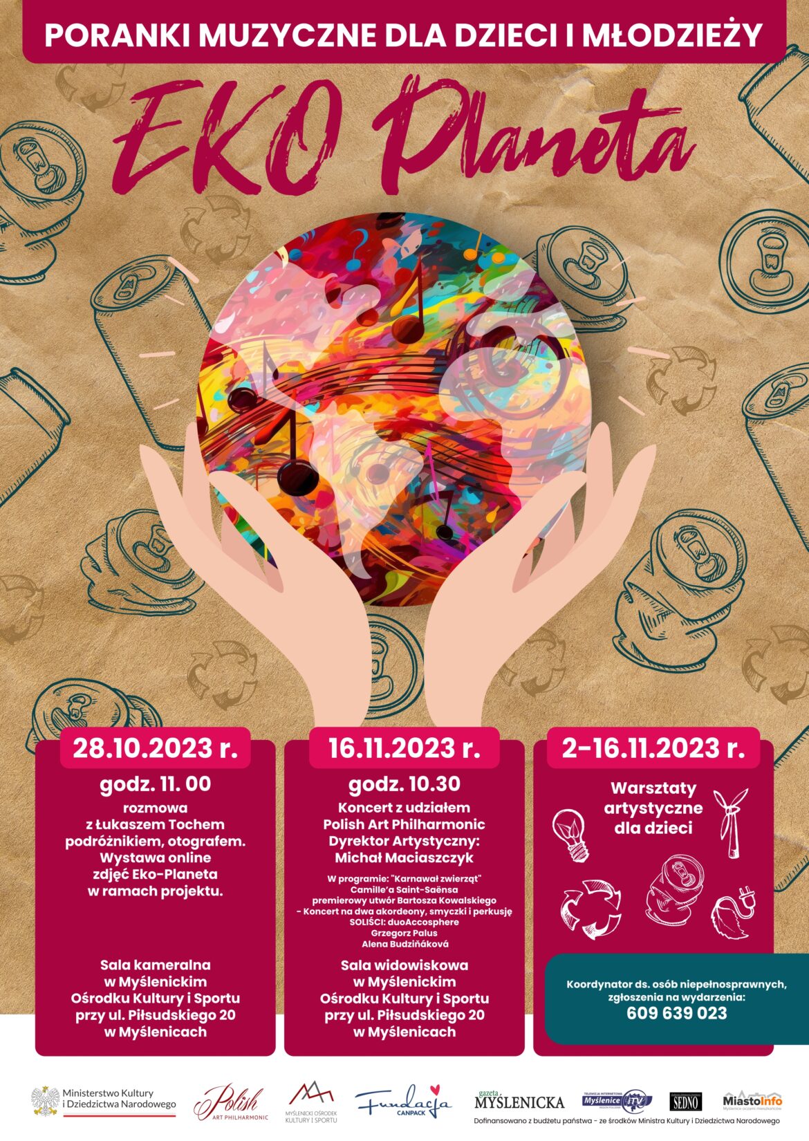 – W tym roku tematem przewodnim jest nasza planeta, a tytuł projektu to Eko- Planeta. Dzięki wsparciu Ministerstwa Kultury i Dziedzictwa Narodowego oraz sponsora: Fundacji Canpack od 3 listopada 2023 r. realizowane będą warsztaty plastyczne – informuje Polish Art Philharmonic.