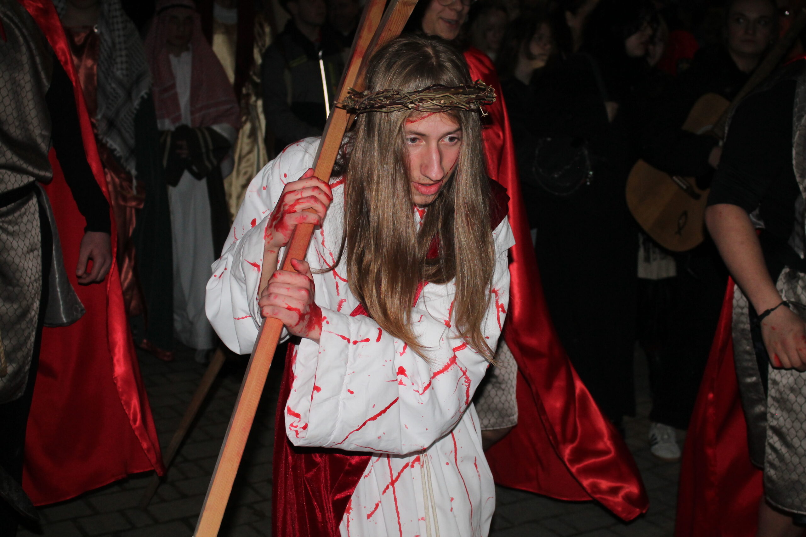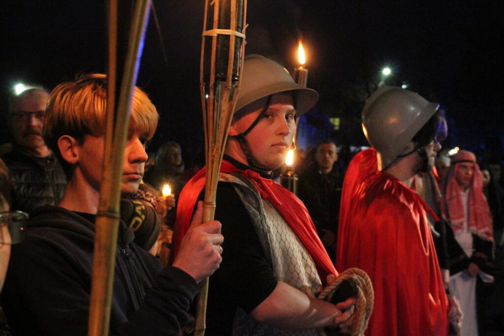 Około godziny 18:20 uczestnicy wyruszyli w drogę ulicami Myślenic, kierując się w stronę Rynku oraz kościoła Narodzenia Najświętszej Maryi Panny. Inscenizacja była wspólną inicjatywą dwóch parafii, a w tym roku towarzyszyło jej hasło „Kim jestem”. Wierni modlili się w intencji pokoju na świecie oraz bezpieczeństwa Ojczyzny, niosąc ze sobą świece, które podkreślały podniosły i refleksyjny charakter wydarzenia.