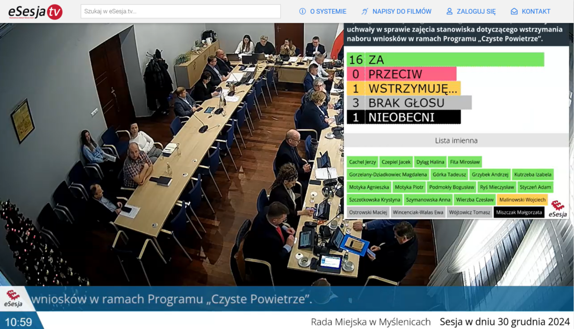 Jedną z uchwał przyjętych przez Radę Miejską w Myślenicach podczas ostatniej w 2024 roku sesji była ta, w której radni zajęli stanowisko w sprawie wstrzymania naboru wniosków w ramach rządowego programu „Czyste Powietrze”. Jest to stanowisko krytyczne i zarazem apel o niezwłoczne przywrócenie naboru. Spośród 20 obecnych na sali radnych za przyjęciem uchwały zagłosowało 16.