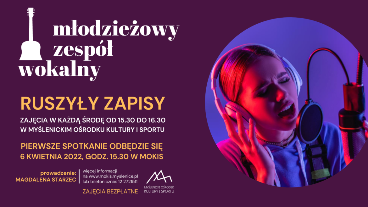 Myślenicki Ośrodek Kultury i Sportu zaprasza młodzież do skorzystania z nowej oferty programowej. Już 6 kwietnia ruszają zajęcia Młodzieżowego Zespołu Wokalnego. Grupy wokalnej, która w swoim repertuarze będzie mieć muzykę rozrywkową i klasyczną. Prowadzone w otwartej i nowatorskiej technice zajęcia, to atrakcyjna i bezpłatna oferta dla wszystkich miłośników śpiewu od 14 roku życia.