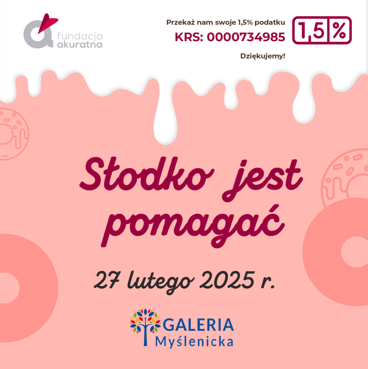 Już w najbliższy czwartek – 27 lutego, zapraszamy do wzięcia udziału w wyjątkowej akcji „Słodko jest pomagać!”, która odbędzie w Galerii Myślenickiej. Już od godziny 9:00 przyjdź, odwiedź stoisko Fundacji Akuratna i spróbuj pysznych, domowych faworków. Całkowity dochód ze sprzedaży pomoże fundacji w dalszym niesieniu pomocy.