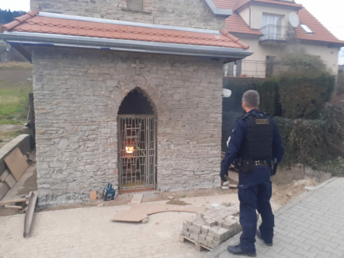 W niedziele (7.11) dyżurny myślenickiej komendy w trybie natychmiastowym skierował patrol do Jasienicy, gdzie według zgłoszenia telefonicznego, ktoś niszczył przydrożną kapliczkę. Policjanci ogniwa patrolowo-interwencyjnego, którzy bezzwłocznie pojechali na miejsce. Okazało się, że szyba w oknie kapliczki została rozbita, a sprawca jest wewnątrz.
