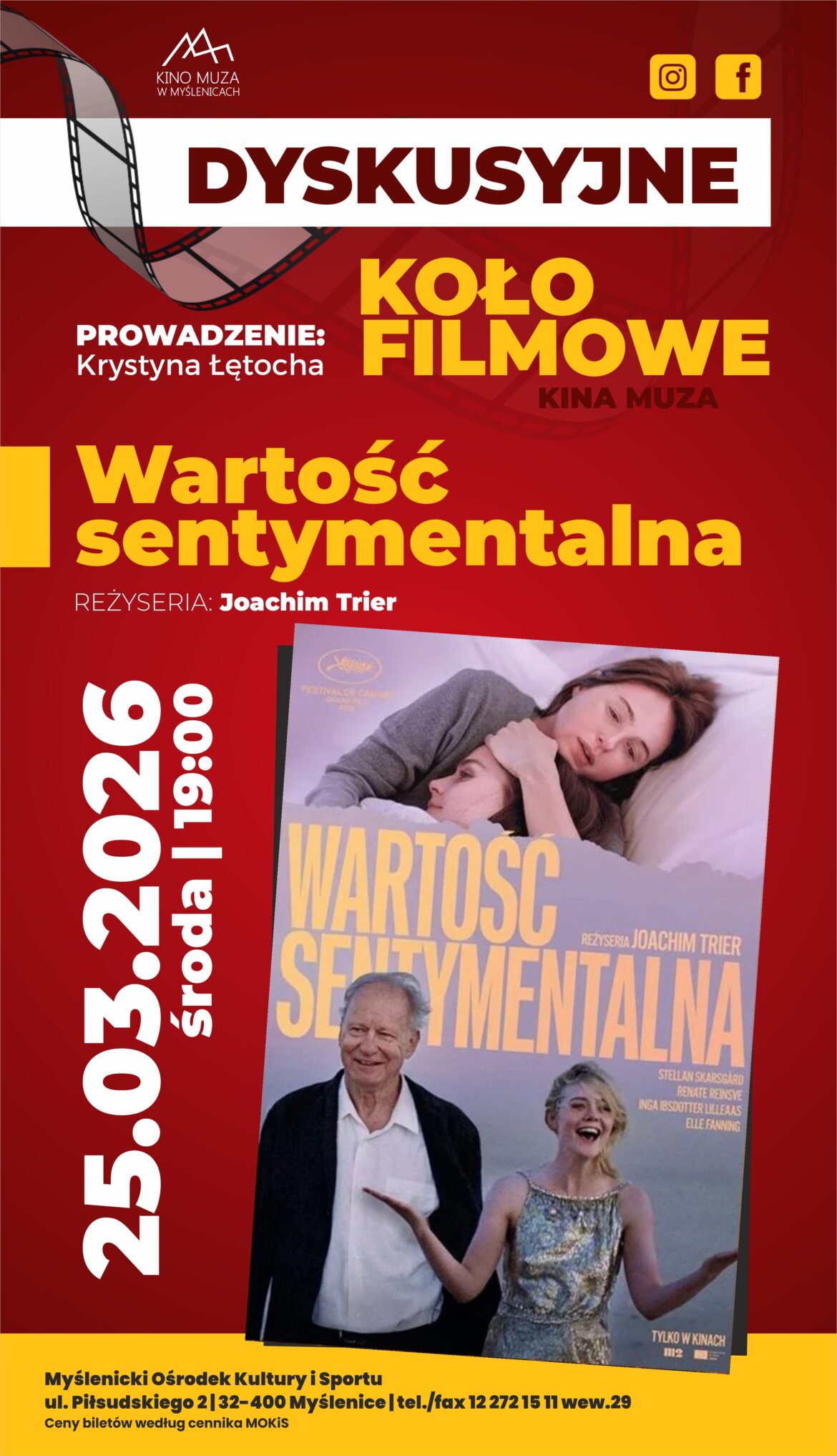 W środę 25 marca o godz. 19 w kinie „Muza” w Myślenicach odbędzie się kolejne spotkanie Dyskusyjnego Koła Filmowego. Uczestnicy obejrzą film „Wartość sentymentalna” w reżyserii Joachima Triera, a dyskusję poprowadzi Krystyna Łętocha.