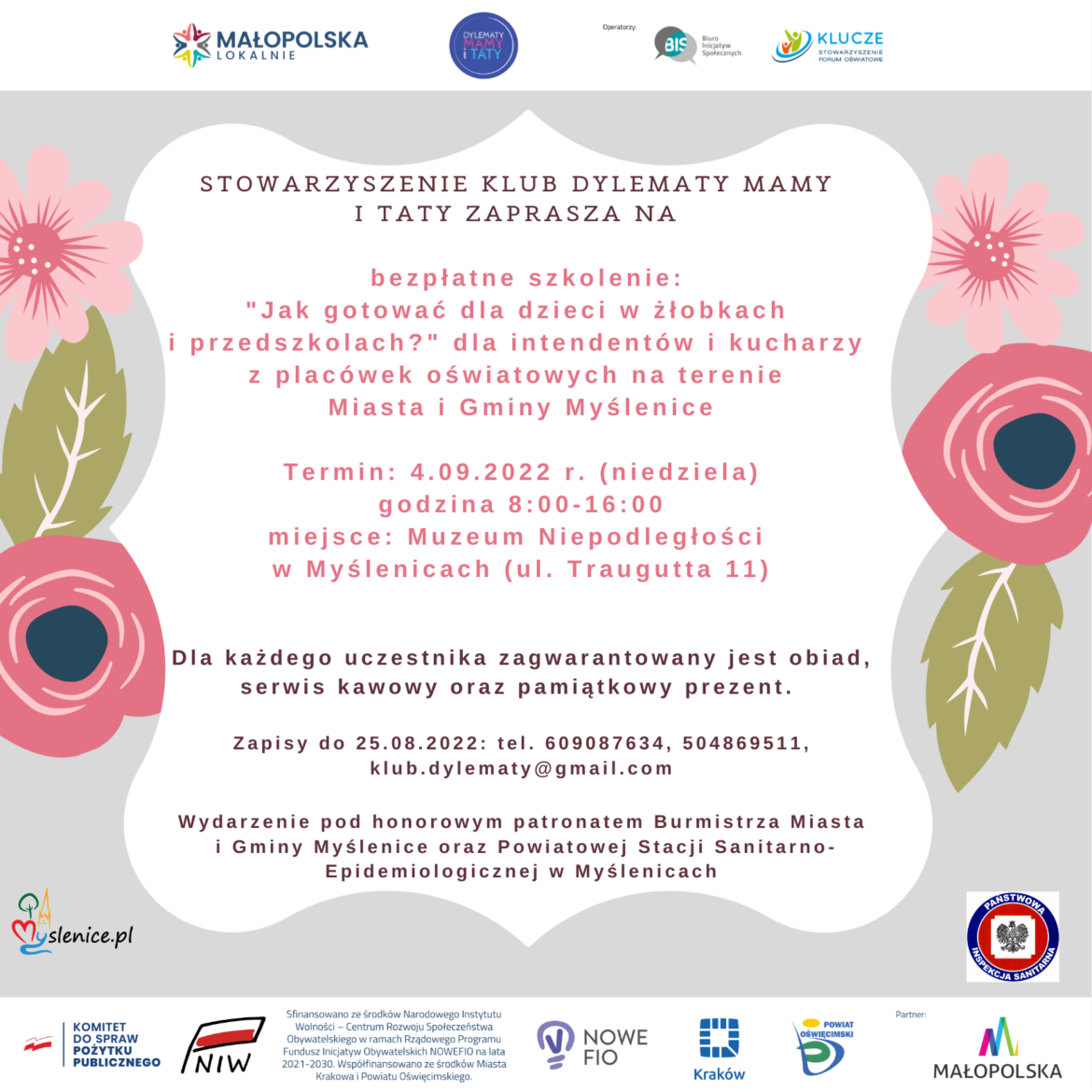 Już 4 września 2022 roku długo wyczekiwany i ważny projekt – szkolenie „Jak gotować dla dzieci w żłobkach i przedszkolach” dla intendentów i kucharzy z placówek oświatowych na terenie Miasta i Gminy Myślenice. Projekt jest realizowany w ramach środków FIO Małopolska Lokalnie. Honorowy patronat sprawują: Burmistrz Miasta i Gminy Myślenice oraz Powiatowa Stacja Sanitarno-Epidemiologiczna w Myślenicach.