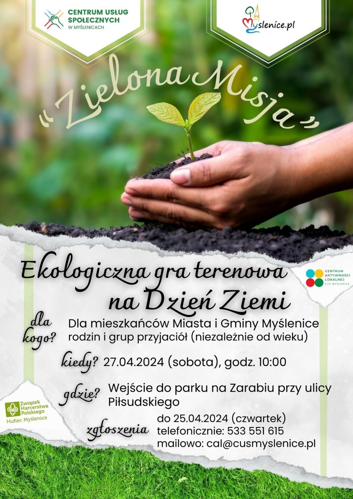 W sobotę 27 kwietnia Centrum Aktywności Lokalnej w Myślenicach razem z Hufcem ZHP Myślenice zapraszamy wszystkich na ekologiczną grę terenową „Zielona Misja”. Gra rozpocznie się o godzinie 10 przy wejściu do parku im. Jana Izydora Sztaudyngera na Zarabiu, tuż za mostem na ul. Piłsudskiego.