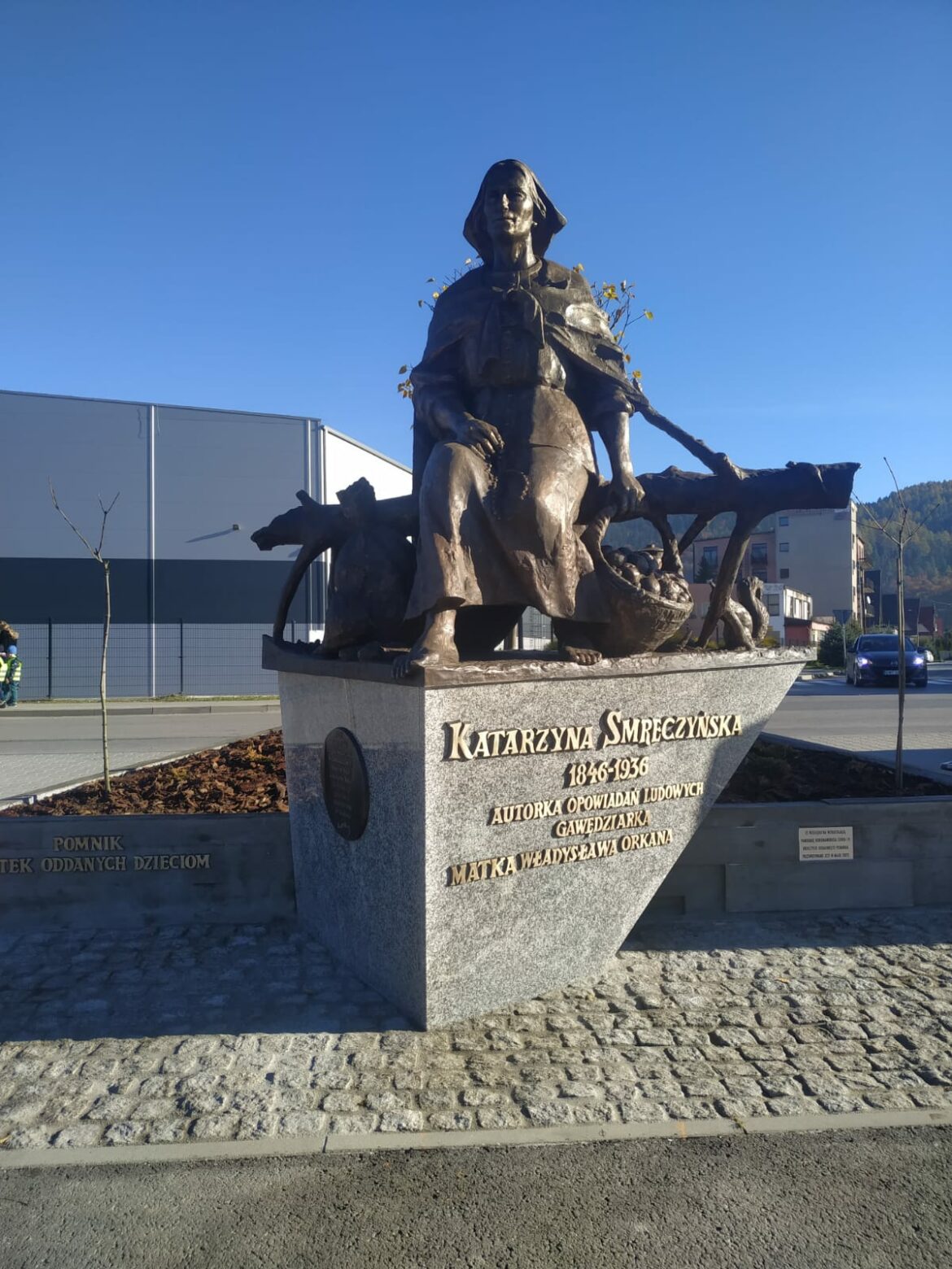 W tym przypadku jest to Katarzyna Smreczyńska – matka sławnego pisarza Młodej Polski, Władysława Orkana. Swoją postawą dała piękne świadectwo oddania macierzyńskiego. Jej działania to m.in. piesze wyprawy z Poręby Wielkiej aż do Krakowa (70 km!) aby dostarczyć jedzenia synom, tylko po to, by mogli spokojnie się uczyć. Pomimo tego, że była kobietą nie wykształconą to była osobą niezwykle światłą dlatego poświęciła się by jej synowie mogli zdobywać wykształcenie. Gmina Pcim leży na trasie jej pieszych wędrówek a miejsce, w którym pomnik został usytuowany jest symbolicznym punktem spotkań matki z synami, których niecierpliwie oczekiwała z początkiem wakacji.