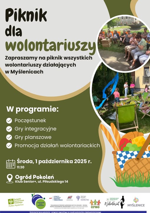Klub Senior+ w Myślenicach oraz myśleniccy harcerze zapraszają wszystkich wolontariuszy działających w Myślenicach na piknik w Ogrodzie Pokoleń. Wydarzenie odbędzie się w środę 1 października przy siedzibie Klubie Seniora (ul. Piłsudskiego 14).