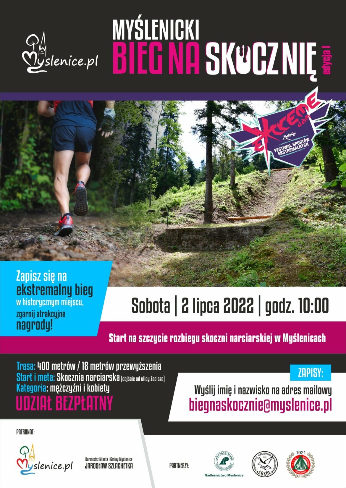 Zapisy na bieg prowadzone są pod specjalnym adresem mailowym: biegnaskocznie@myslenice.pl Festiwal Sportów Ekstremalnych – Myślenicki Bieg na Skocznię Sobota 2 lipca 2022, start: 10:00 Odbiór numerów startowych: 9:30 Dojście do skoczni od ulicy Zacisze drogą szutrową za szlabanem lub od ulicy Zamkowej. Uział w biegu jest bezpłatny! – Zapraszam do zapisów na pierwszą edycję Myślenickiego Biegu na Skocznię, podczas której biegaczy czeka ciekawa terenowa trasa ze startem na rozbiegu skoczni i finiszem po zeskoku i najeździe legendarnego obiektu. Przebiegnięcie 400-metrowej i 18 metrów przewyższenia trasy nie powinno być trudnym wyzwaniem dla żadnego biegacza.