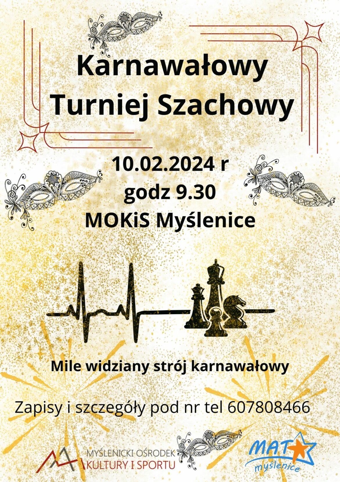 MAT Myślenice na Karnawałowy Turniej Szachowy, który odbędzie się w sobotę 10 lutego w Myślenickim Ośrodku Kultury i Sportu. Rozpoczęcie turnieju o godz. 10.