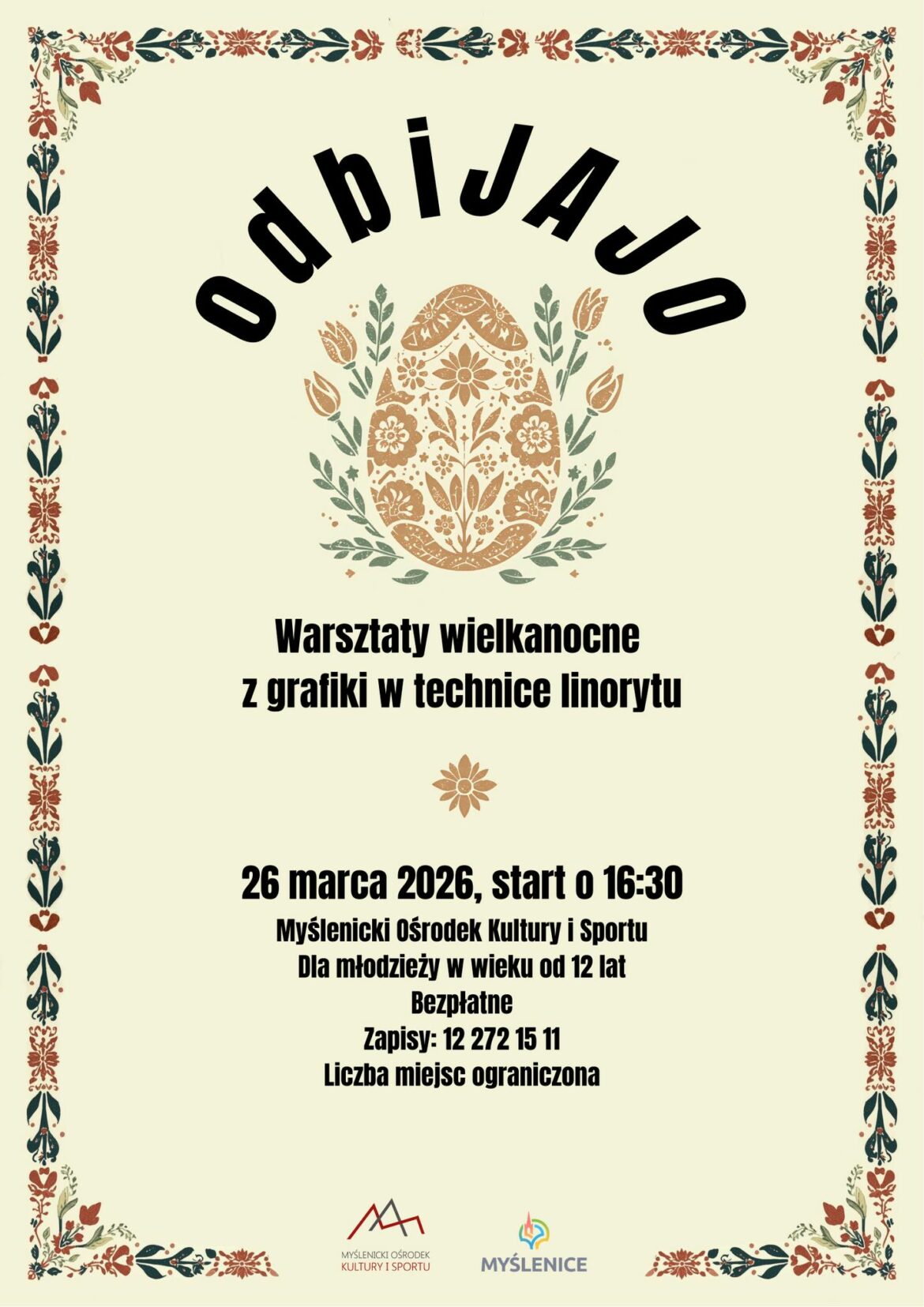 W czwartek 26 marca o godz. 16.30 w Myślenickim Ośrodku Kultury i Sportu odbędą się warsztaty dla młodzieży, w czasie których będzie można nauczyć jak techniką linorytu wykonać wielkanocne jajo.