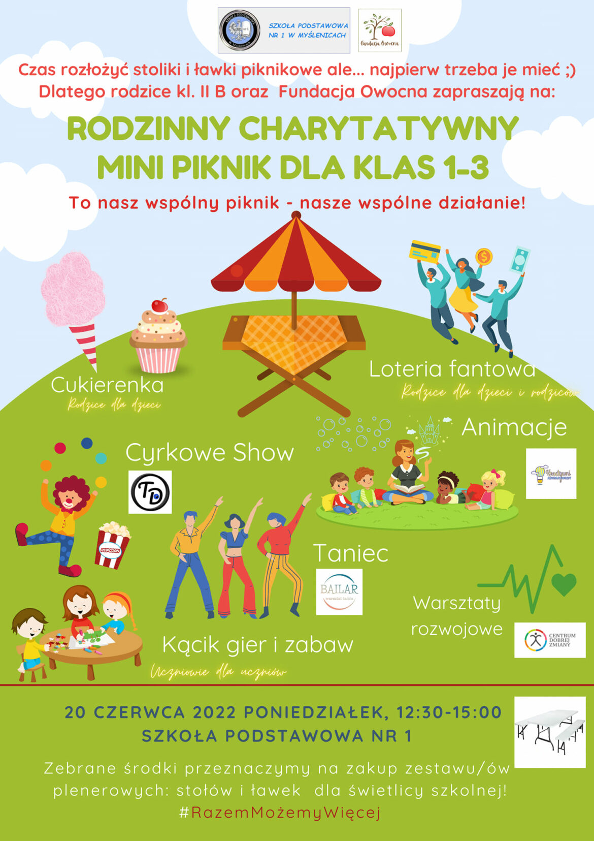 Piknik na pozyskanie funduszy na zakup piknikowych zestawów ławek i stołów dla najmłodszych uczniów Szkoły Podstawowej nr 1 w Myślenicach, by w cieniu starych drzew podczas upałów mogli czytać, rysować, tworzyć…