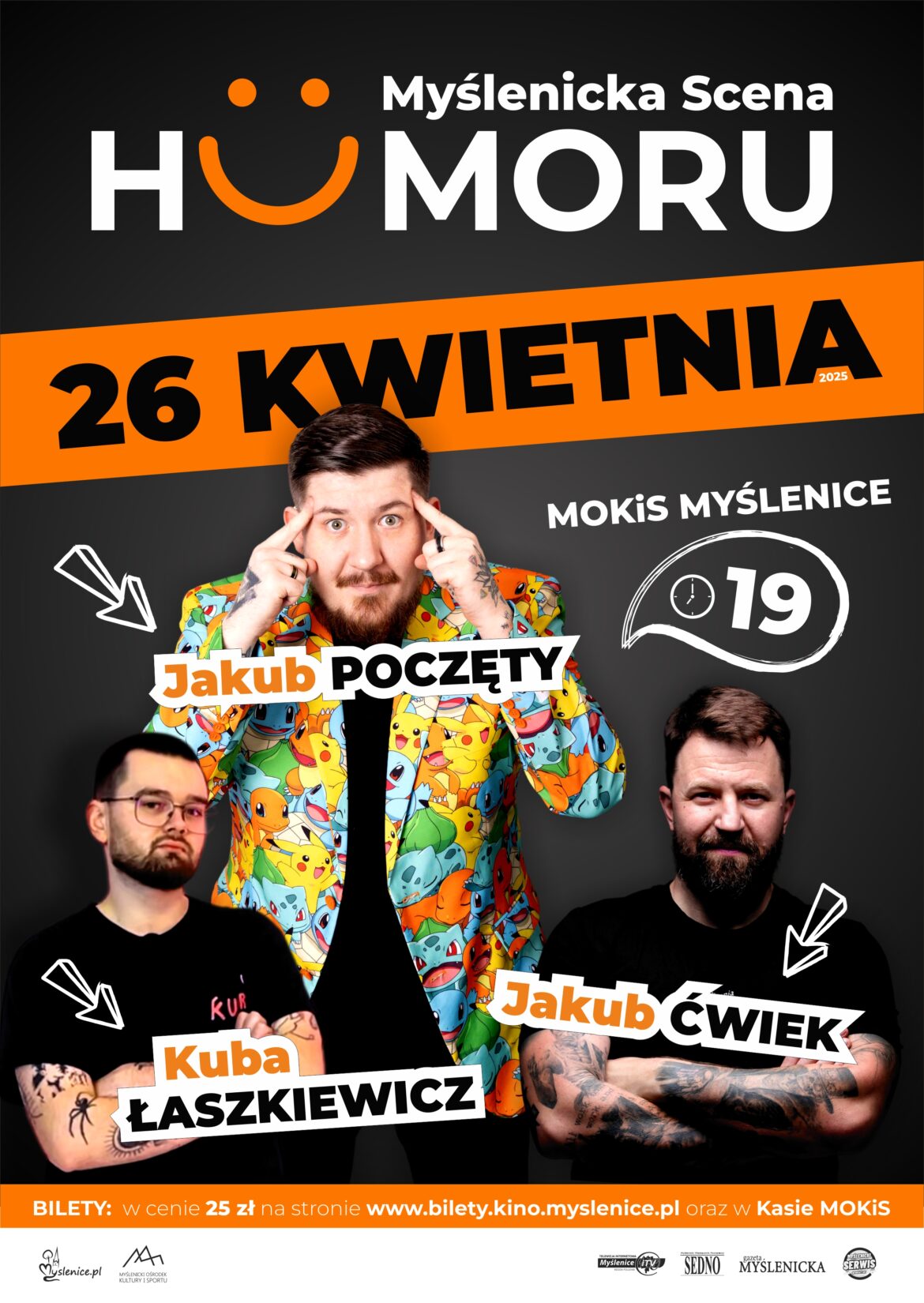 W sobotę 24 maja o godz. 19 w Myślenickim Ośrodku Kultury i Sportu odbędzie się kolejne wydarzenie z cyklu „Myślenicka Scena Humoru”. Tym razem wystąpią: Jakub Poczęty, Kuba Łaszkiewicz i Jakub Ćwiek.