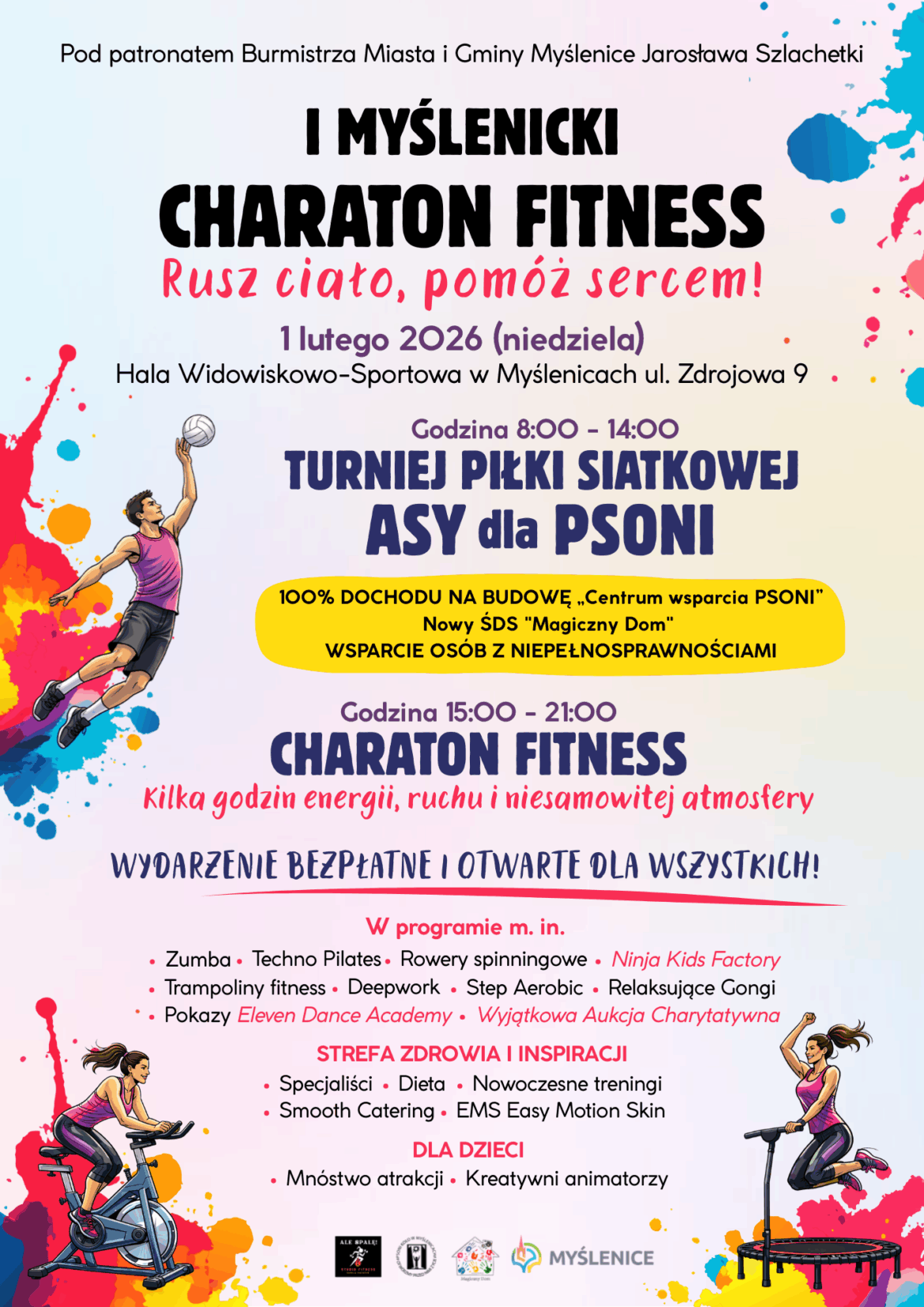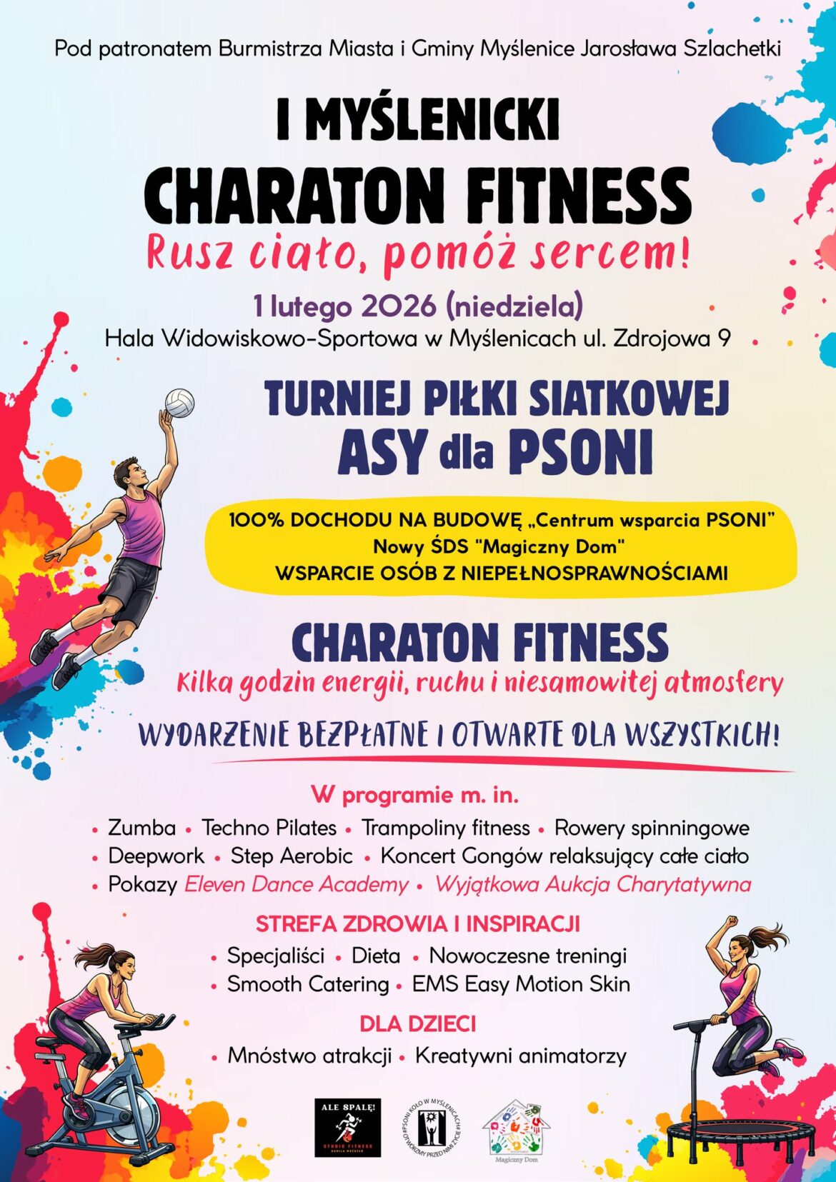 To kilka godzin ruchu, ale też ogromna dawka wiedzy, inspiracji i motywacji. Będzie okazja poznać różne formy aktywności, porozmawiać ze specjalistami, dowiedzieć się więcej o zdrowym stylu życia i zobaczyć nowoczesne rozwiązania ze świata fitness. To także świetny czas dla rodzin – atrakcje dla dzieci, kreatywne animacje, dmuchańce i przestrzeń, w której każdy znajdzie coś dla siebie – piszą organizatorzy, czyli Studio Ale Spalę i myślenickie koło Polskiego Stowarzyszenia na rzecz Osób z Niepełnosprawnością Intelektualną (PSONI)
